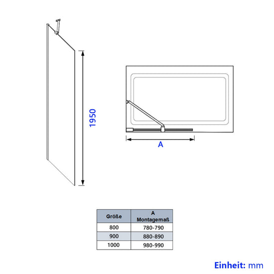 Hinweis: Erhältlich in 90 × 195 cm, 100×195cm. Lieferung erfolgt ohne Duschwanne. Maßtabelle & Montageanleitung als PDF verfügbar.