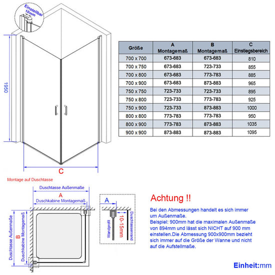 Duschkabine mit doppelter Schwingtür für Eckeinbau, 195 cm hoch, leicht zu reinigen