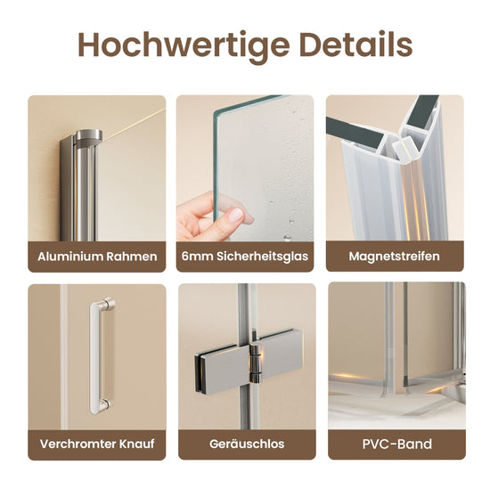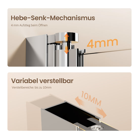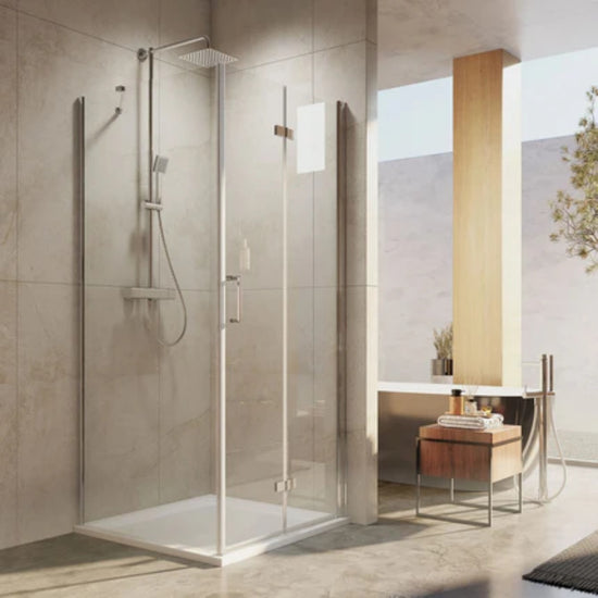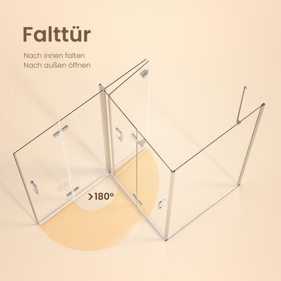 Diese hochwertige Duschabtrennung kombiniert ein Festelement mit einer faltbaren Drehfalttür und eignet sich ideal für kleine Badezimmer. Die Tür ist mittig faltbar, mit Hebe-Senkmechanismus und Magnetverschluss für optimale Dichtheit.
