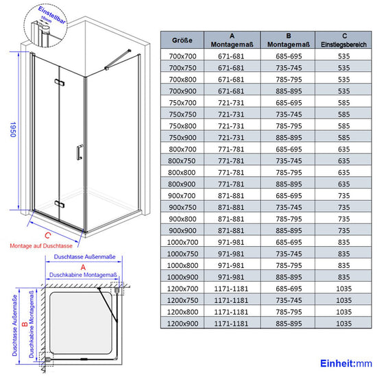 Duschabtrennung mit Drehfalttür für Eckeinbau, 195 cm hoch