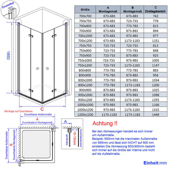 - Maße: erhältlich von 75×75 cm bis 120×120 cm, Höhe 185 cm