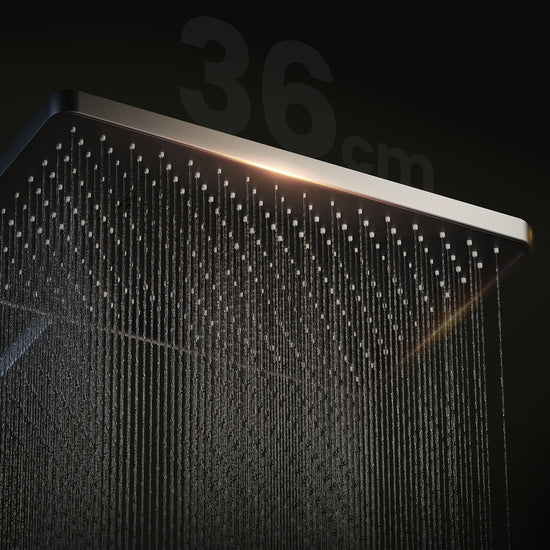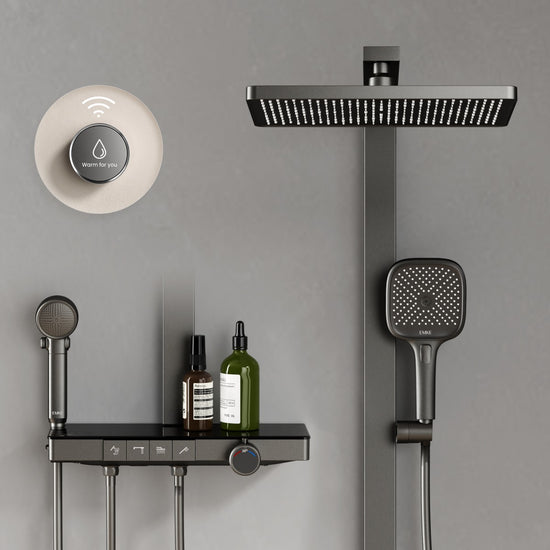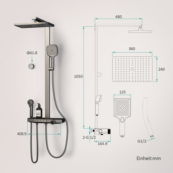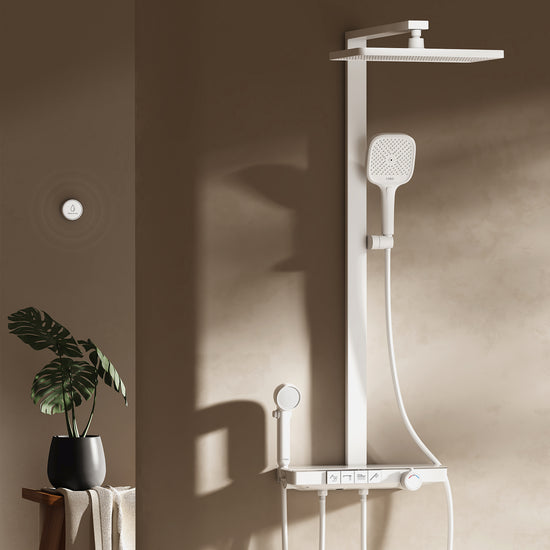 Dieses Duschsystem bietet komfortables Duschen mit präziser Temperaturregelung, großzügiger Ablagefläche und moderner eckiger Optik. Ideal für jedes moderne Badezimmer.