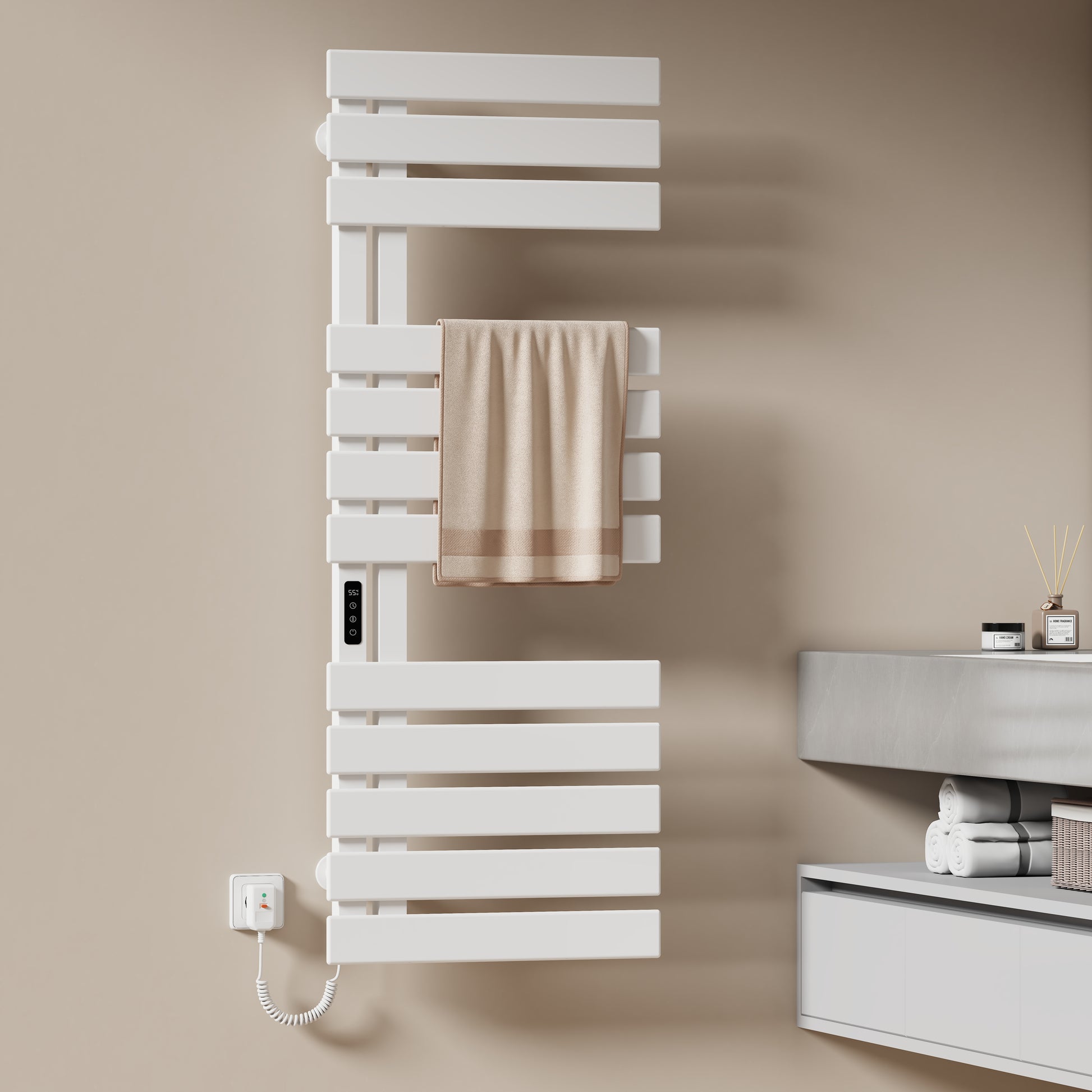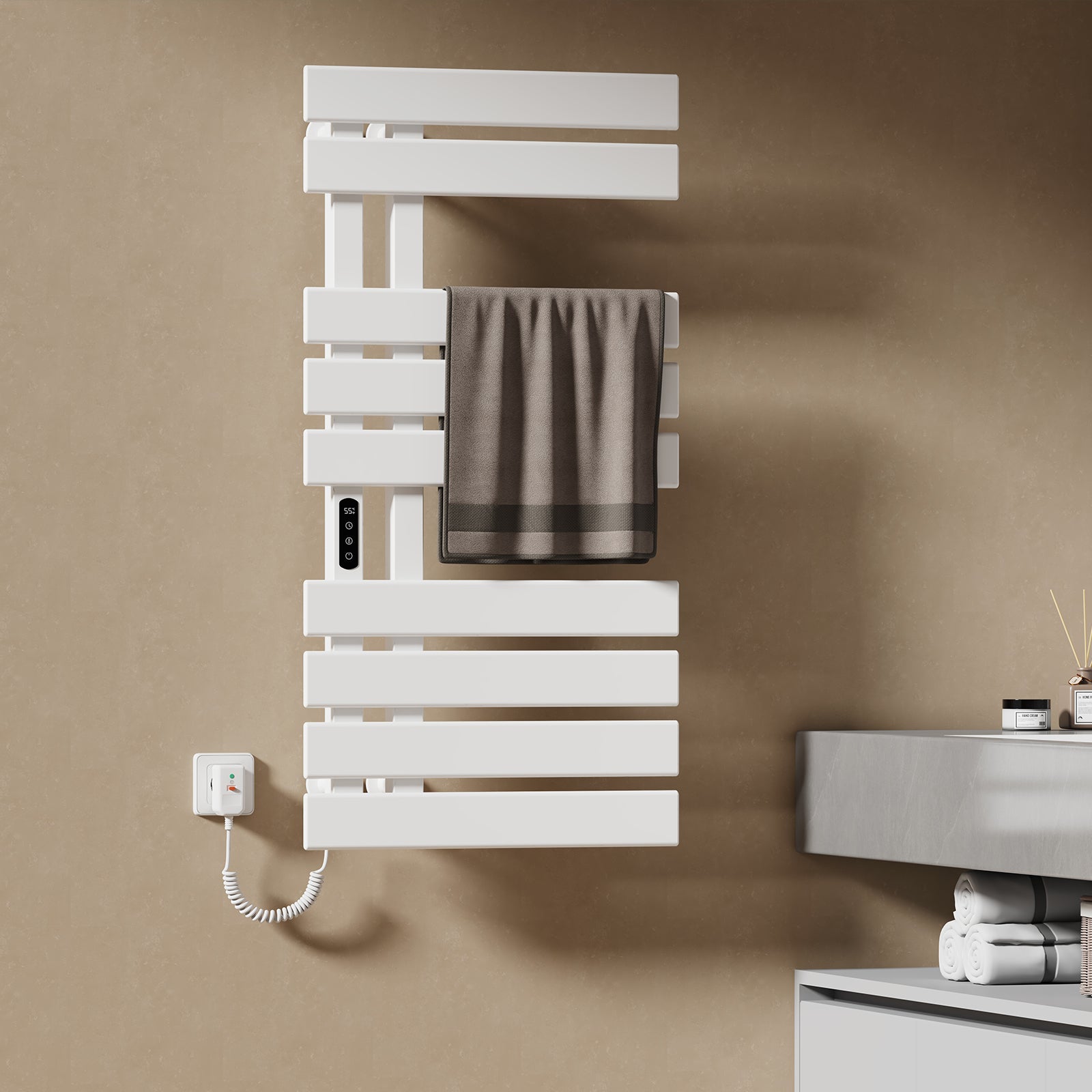 Dieser elektrische Handtuchheizkörper trocknet Handtücher und Kleidung schnell und effizient mit moderner Kohlefaser-Technologie.