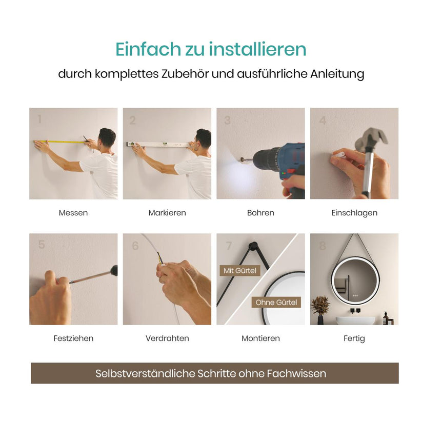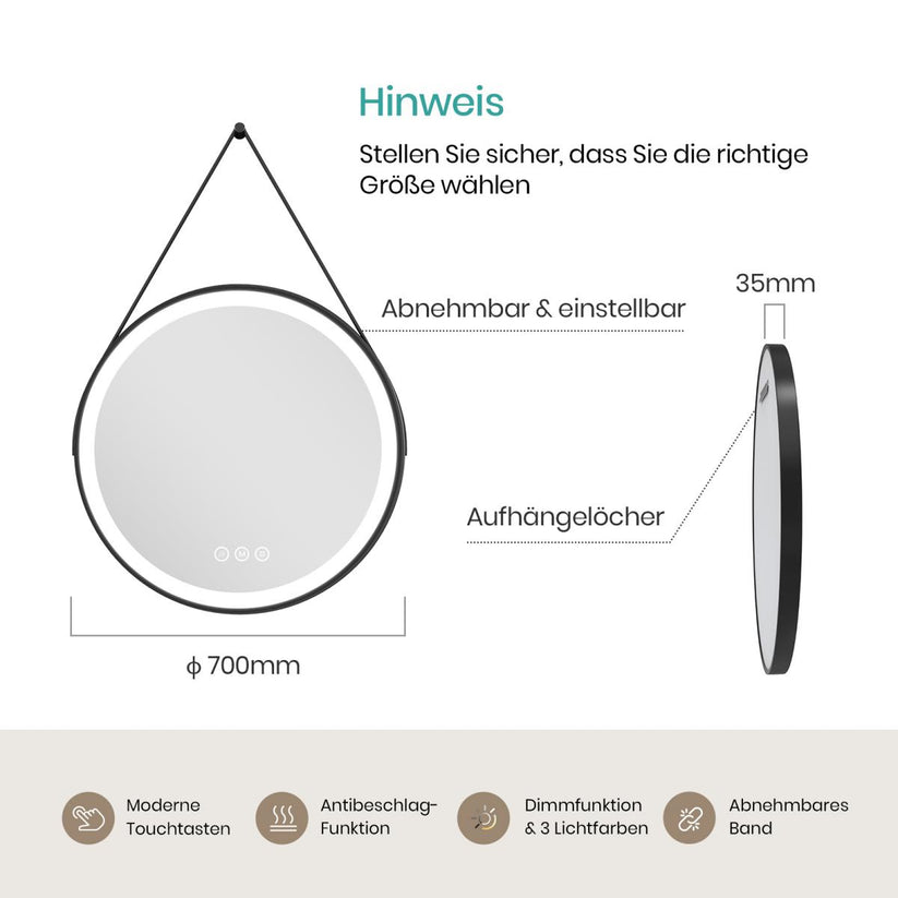 Dieser runde LED-Spiegel mit Kunstleder-Aufhängung ist ein stilvoller Blickfang für Bad, Wohnzimmer oder Flur. Die matte Lichtumrandung sorgt für stimmungsvolle Beleuchtung und modernes Design.