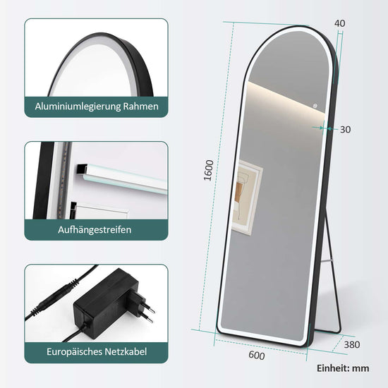 Ganzkörperspiegel mit LED-Beleuchtung & Aluminiumrahmen – dimmbar, 3 Lichtfarben, Stand- & Wandspiegel