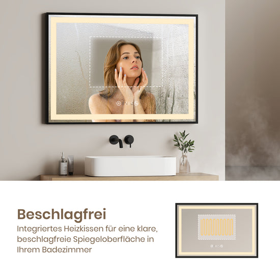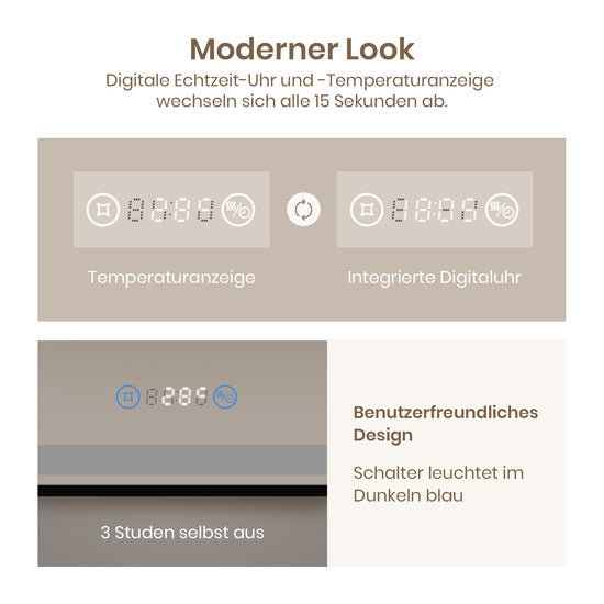 Spiegelheizung, LED-Uhr, Helligkeit einstellbar, Speicherfunktion, Automatische Abschaltung nach 3 Stunden und Temperaturanzeige