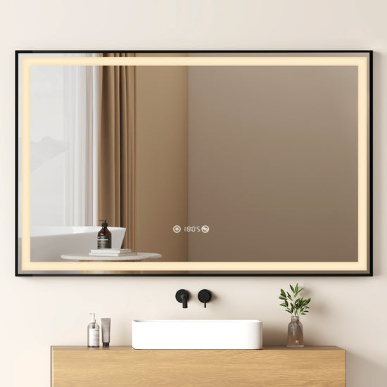 LED-Badezimmerspiegel mit schwarzem Rahmen, Uhr, Temperaturanzeige & Anti-Beschlagfunktion