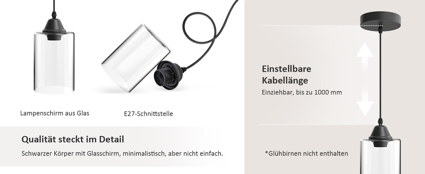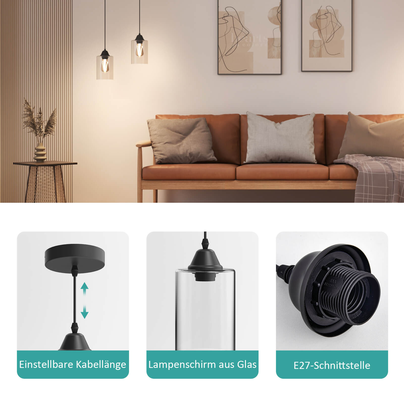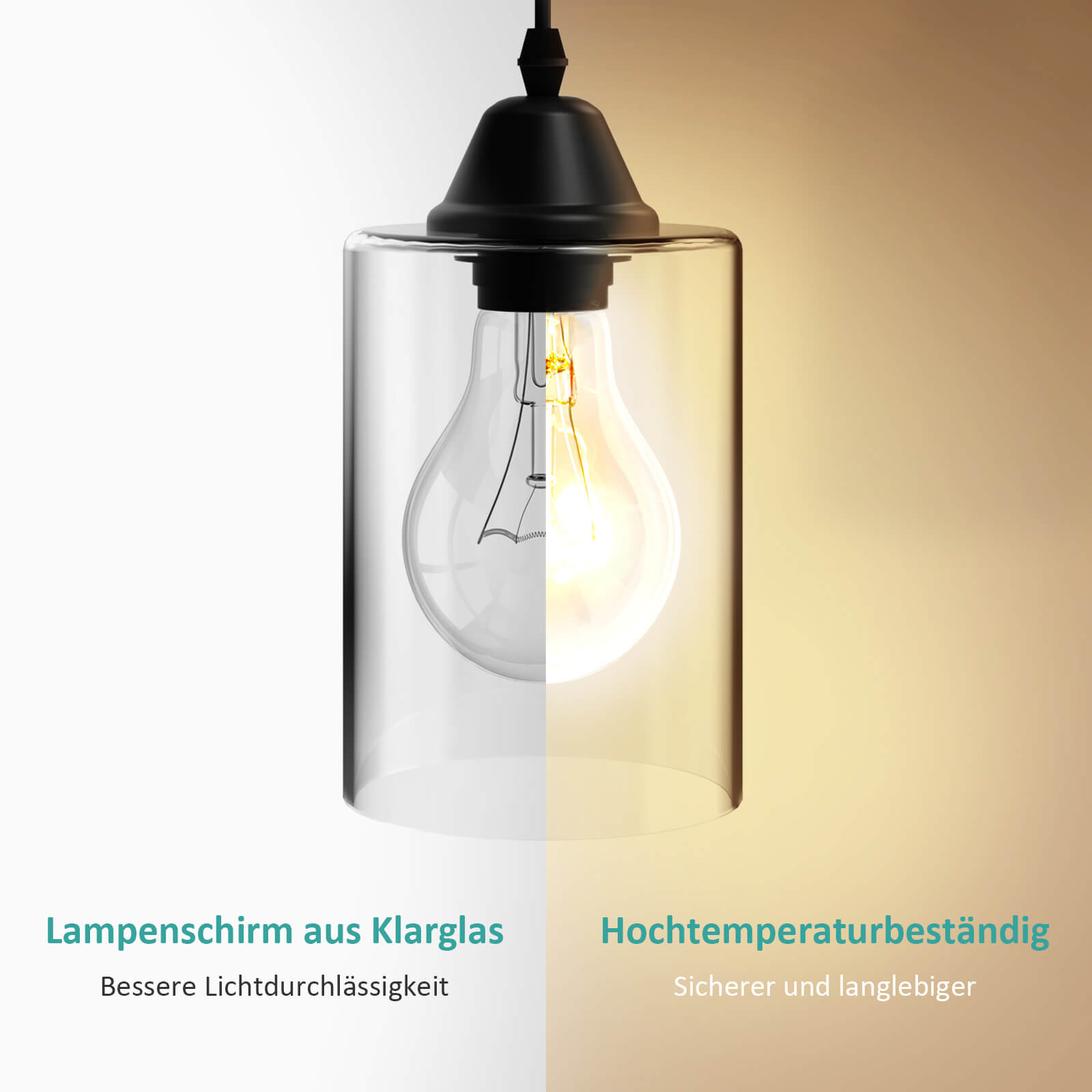 - Schlichtes und elegantes Design: Die transparente Glasabdeckung besticht durch ihre stilvolle Einfachheit. Das Licht wird durch das Glas gleichmäßig in alle Ecken des Raumes gestreut. Sowohl die Decke als auch die Drähte sind schwarz gehalten. Dadurch lässt sich die Pendelleuchte problemlos in jeden dekorativen Stil integrieren.