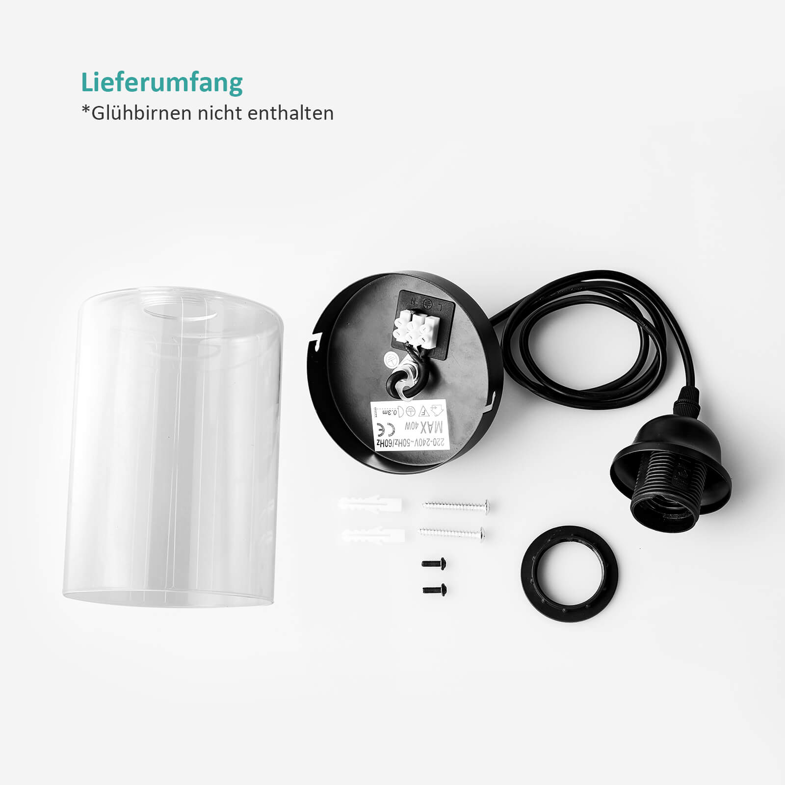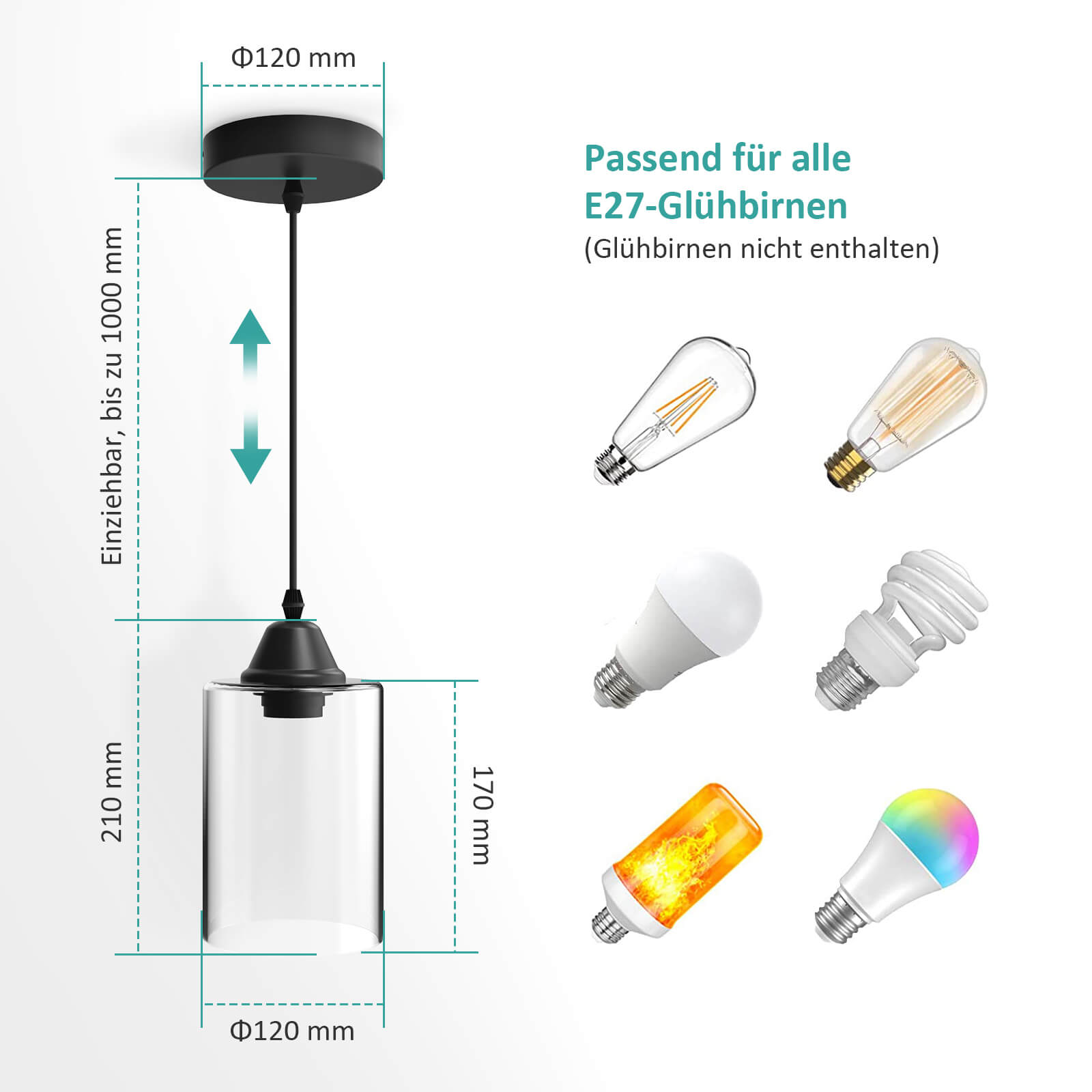 - Artikelbeschreibung: Klarglasschirm (Durchmesser: 120 mm, Höhe: 170 mm) mit einer Deckenplatte (Durchmesser: 120 mm). Installation von Leuchtmitteln des Typs E27. Das Hängekabel der Pendelleuchte hat eine Länge von 100 cm. Das Produkt verfügt über die CE-Zertifizierung und das Kabel ist VDE-zertifiziert. Sie können es daher mit Vertrauen kaufen und verwenden.