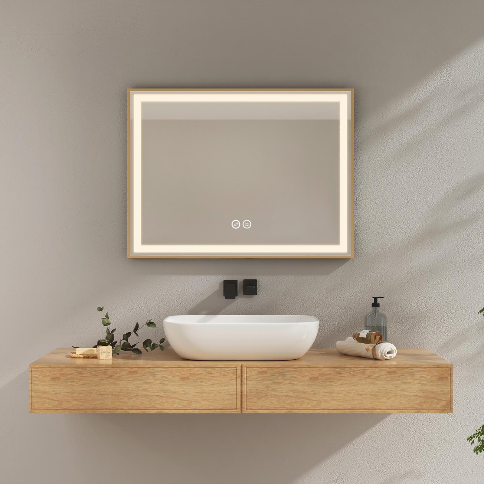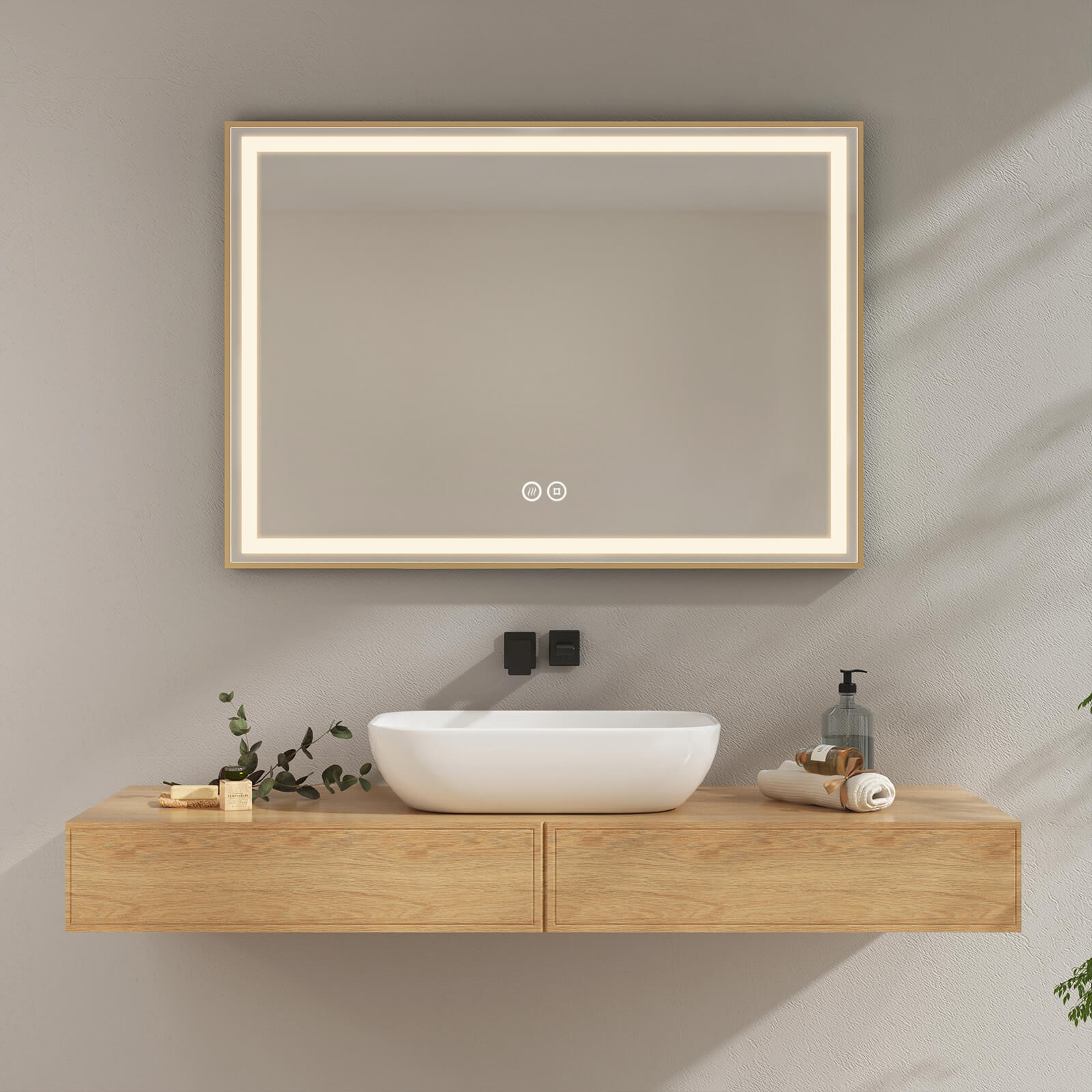 EMKE LM24 LED Badspiegel mit goldenem Rahmen, Anti-Beschlag, Touch-Schalter, neutrales Licht (4300K), dimmbar, waagerecht verwendbar
