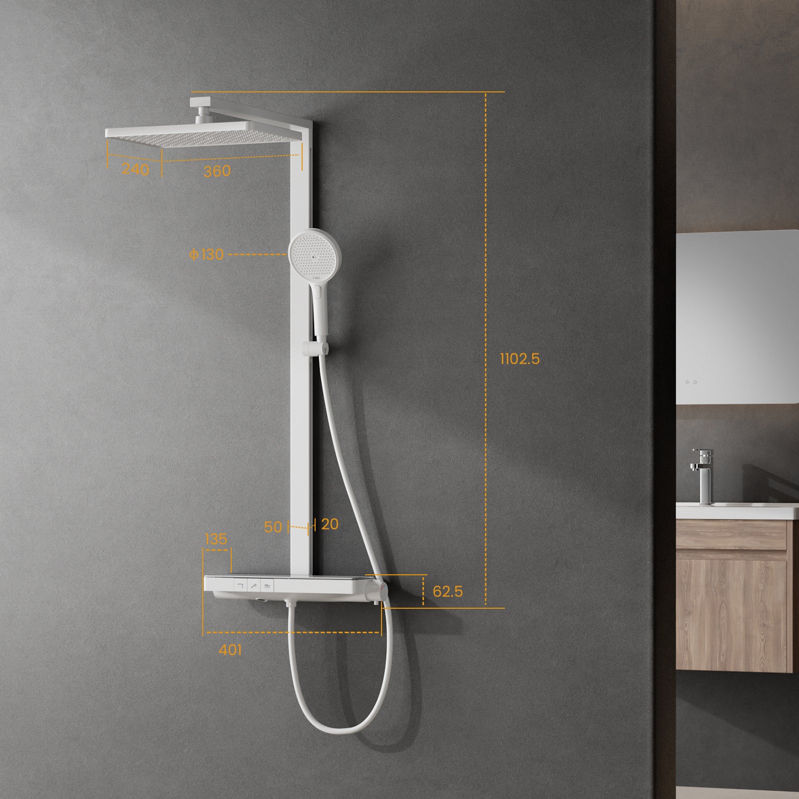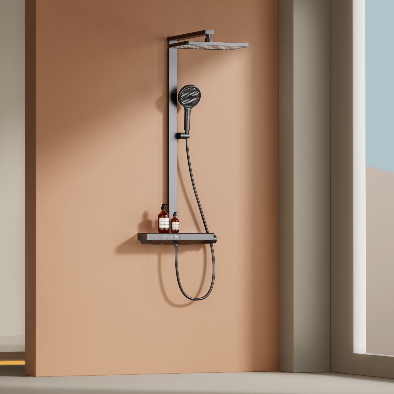 - Thermostat mit Glasablage & Temperaturanzeige – Die praktische Ablage aus gehärtetem Glas bietet Platz für Duschutensilien, die digitale Anzeige zeigt die aktuelle Wassertemperatur