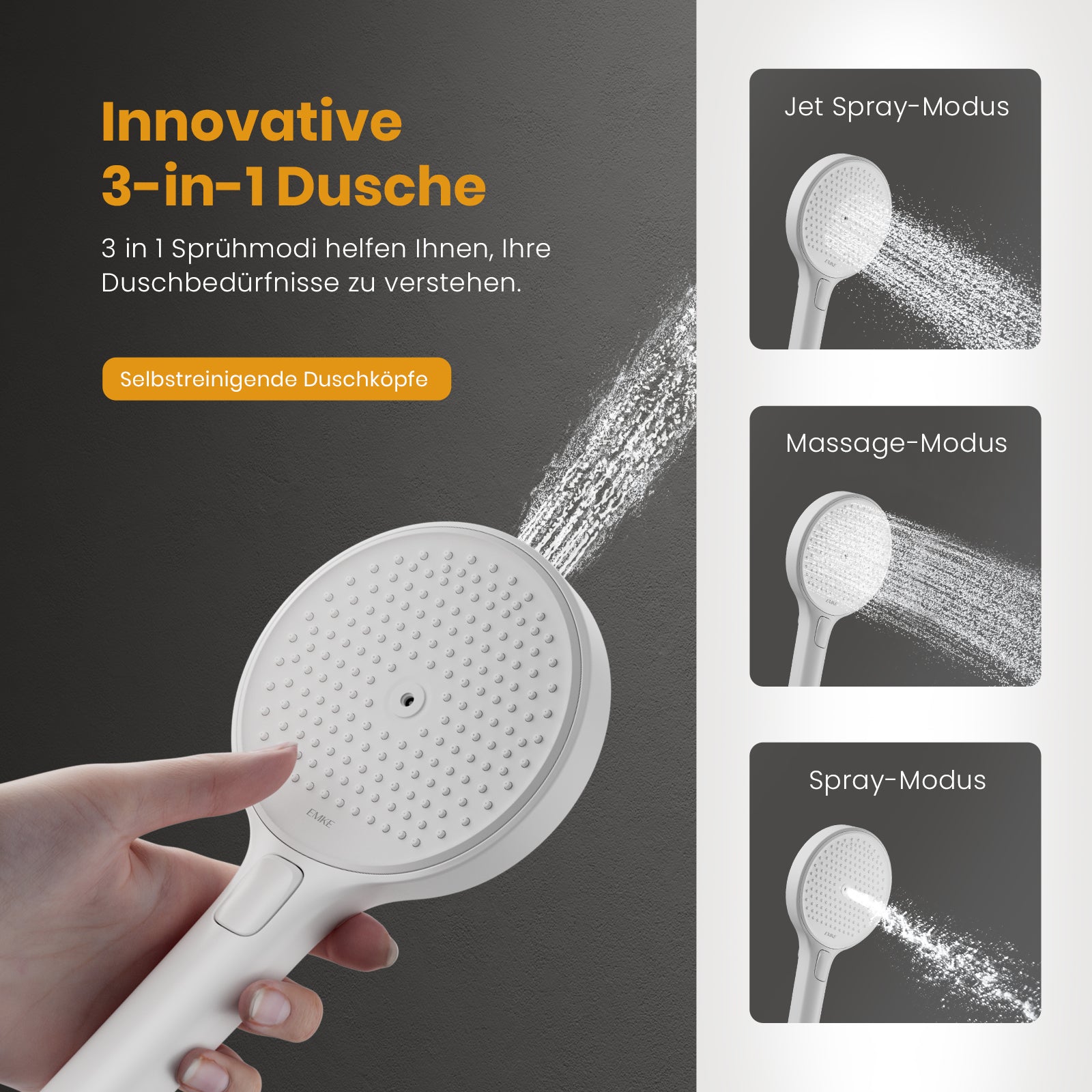 - 3 Wasserstrahl-Positionen per Knopfdruck – Wechseln Sie mühelos zwischen Handbrause, Regendusche (360° drehbar & ±15° neigbar) und bodennahem Strahl