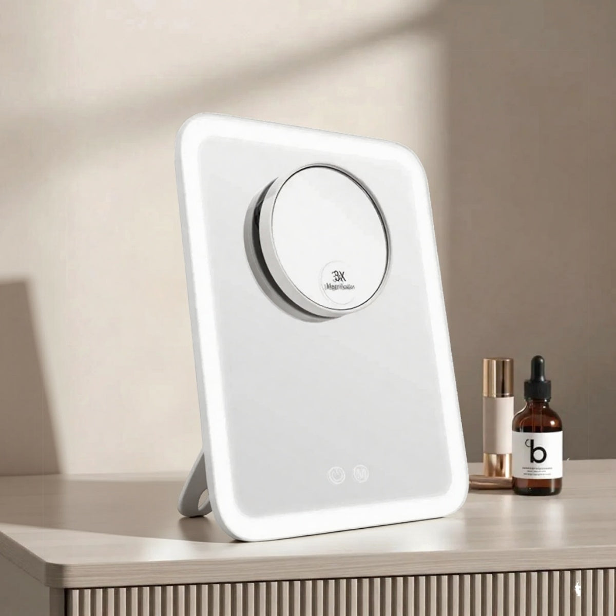 Dieser praktische Kosmetikspiegel bietet eine integrierte LED-Beleuchtung mit drei Lichtfarben und Touch-Steuerung. Der wiederaufladbare Akku sorgt für kabellose Flexibilität – ideal für präzises Make-up oder Rasur.