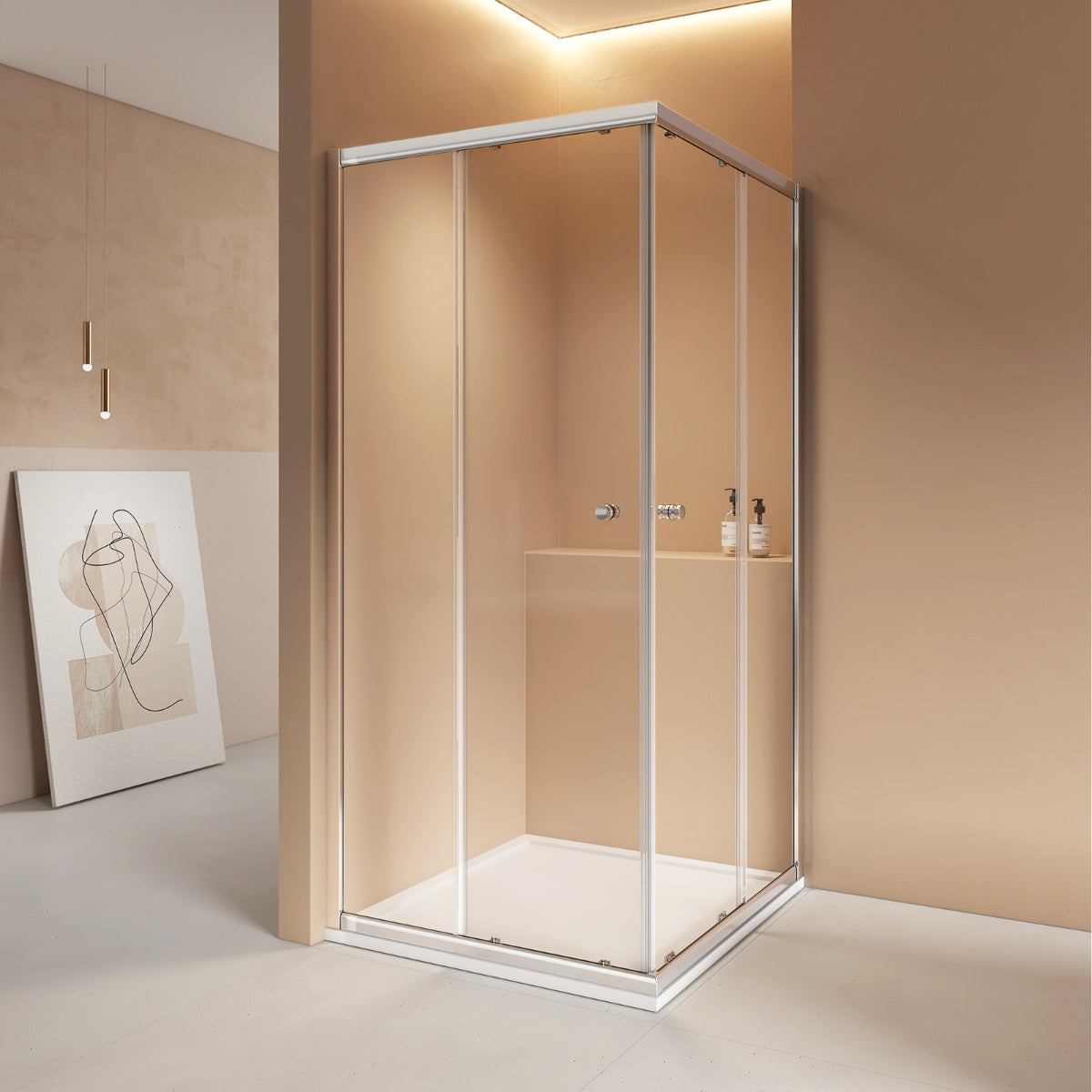Moderne Eckdusche mit Schiebetüren und komfortablem Eckeinstieg – ideal für platzsparende Badlösungen.