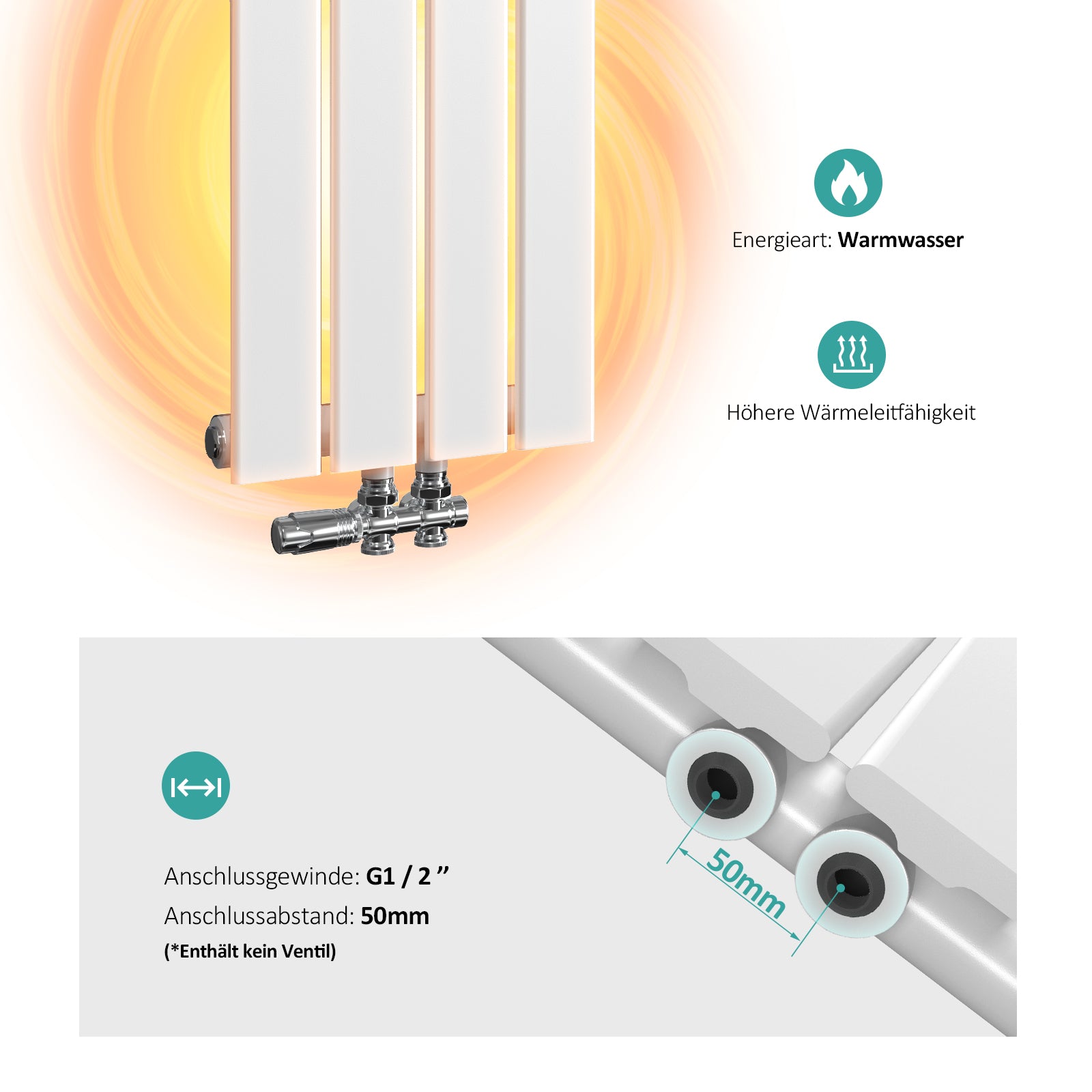 Artikelbeschreibung: Der Heizkörper hat ein ultra-schmales Design mit einer Breite von nur 30 cm und Höhen von 180 cm, 160 cm, 90 cm und 60 cm. Es gibt die Optionen einlagig oder zweilagig.