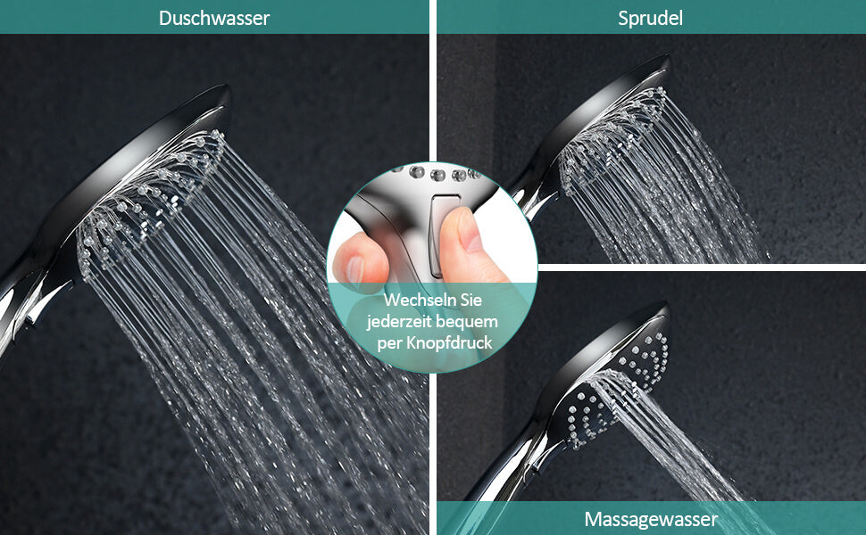 Diese Handbrause bietet drei komfortable Strahlarten per Knopfdruck und sorgt für ein intensives Duscherlebnis – auch bei geringem Wasserdruck. Das robuste verchromte ABS-Gehäuse ist korrosionsbeständig und leicht zu reinigen – ideal für Bad und Spa.