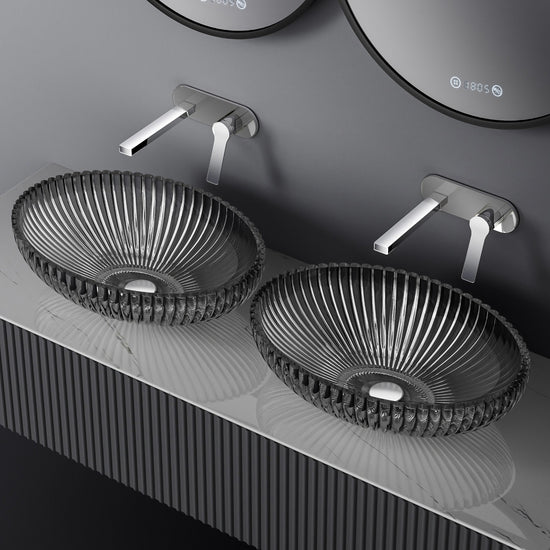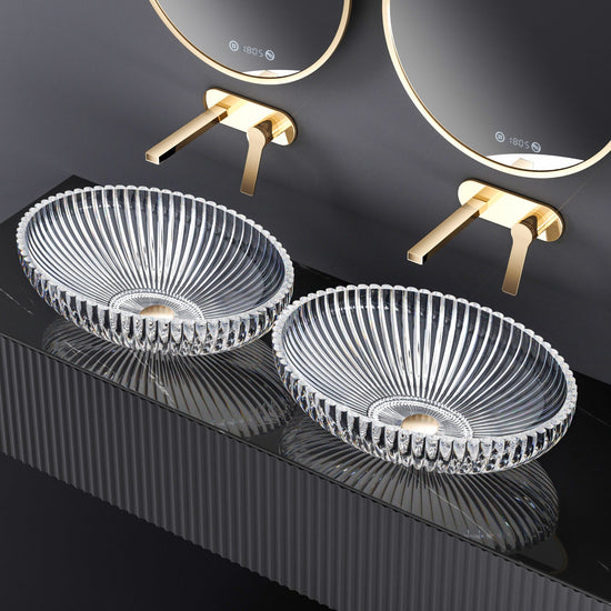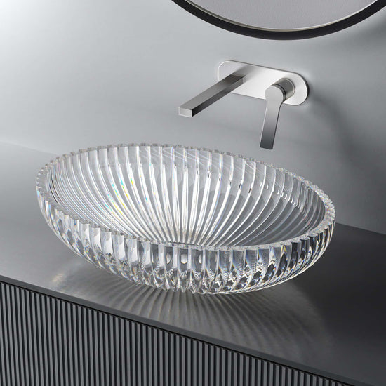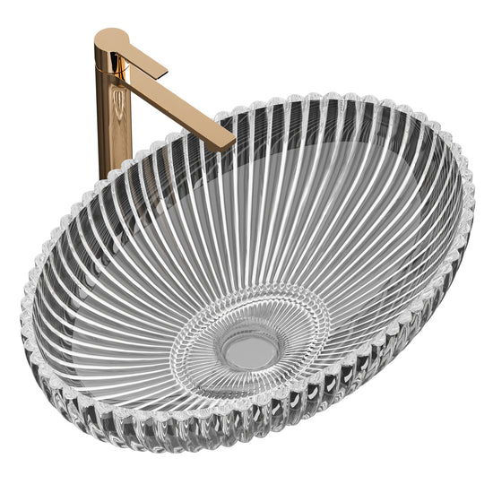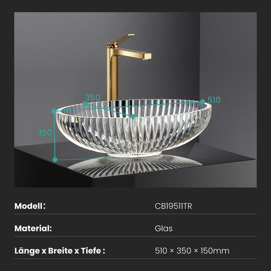 Dieses ovale Aufsatzwaschbecken aus Klarglas besticht durch seine hohe Transparenz und das brillante Design mit diamantgeschliffener Oberfläche – ideal für moderne Badezimmer oder Gästetoiletten.