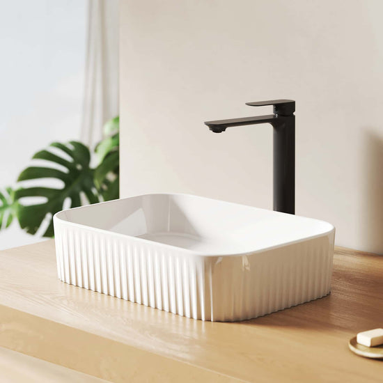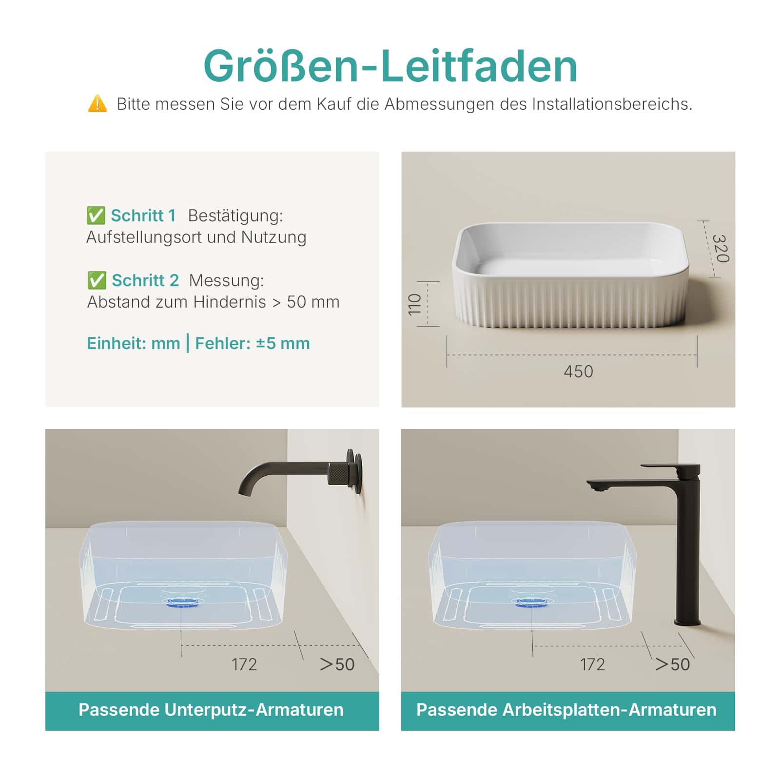 Dieses rechteckige Aufsatzwaschbecken aus hochdichter Keramik besticht durch geriffeltes Design und abgerundete Ecken. Die flexible Armaturenmontage ohne vorgebohrte Löcher macht es zur idealen Wahl für Badezimmer und Gäste-WCs.