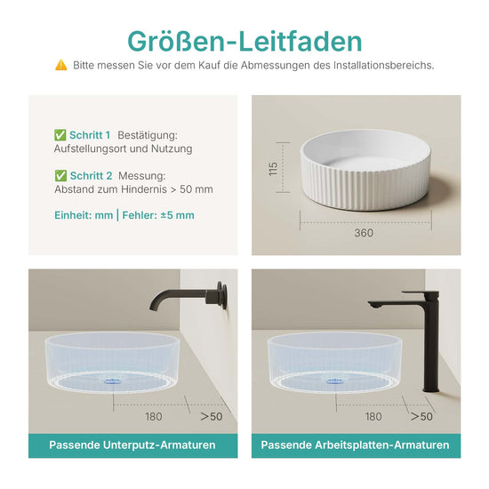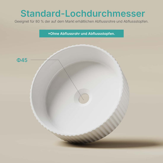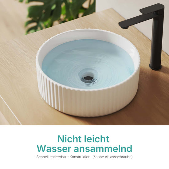 Dieses runde Keramik-Aufsatzwaschbecken überzeugt mit kompaktem Design und flexibler Armaturen-Montage. Das geriffelte Außendesign und die hochdichte Materialqualität machen es zur idealen Lösung für kleine Badezimmer und Gäste-WCs.