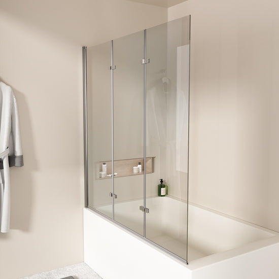 Diese dreiteilige Duschwand kombiniert Schwenk- und Falttür für einen platzsparenden und effektiven Spritzschutz an der Badewanne. Hochwertiges ESG-Sicherheitsglas und ein stabiler Aluminiumrahmen gewährleisten Sicherheit und Langlebigkeit.