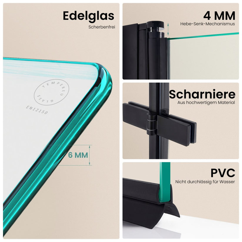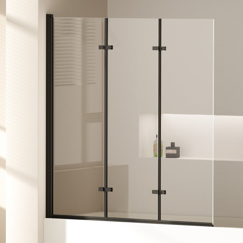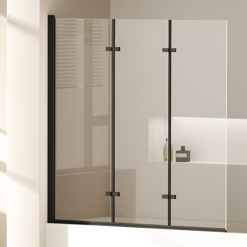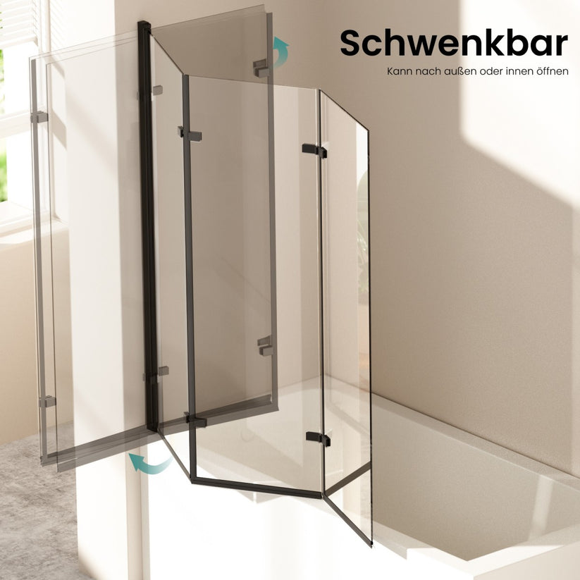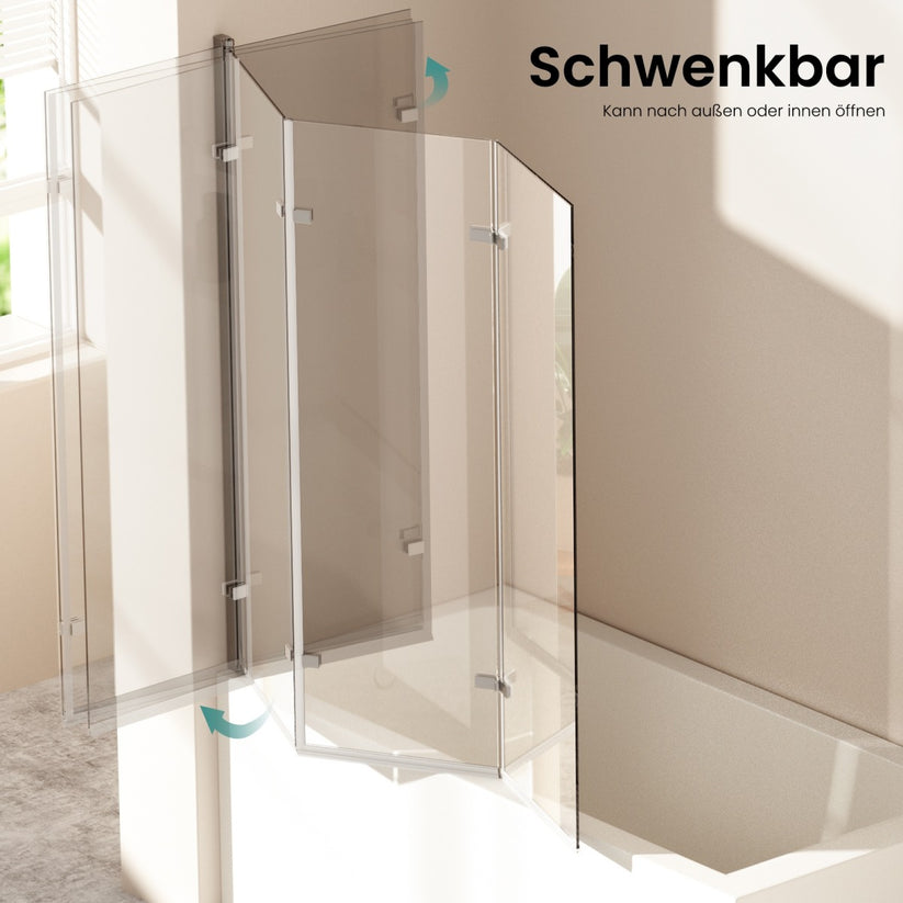 Diese dreiteilige Duschwand kombiniert Schwenk- und Falttür für einen platzsparenden und effektiven Spritzschutz an der Badewanne. Hochwertiges ESG-Sicherheitsglas und ein stabiler Aluminiumrahmen gewährleisten Sicherheit und Langlebigkeit.