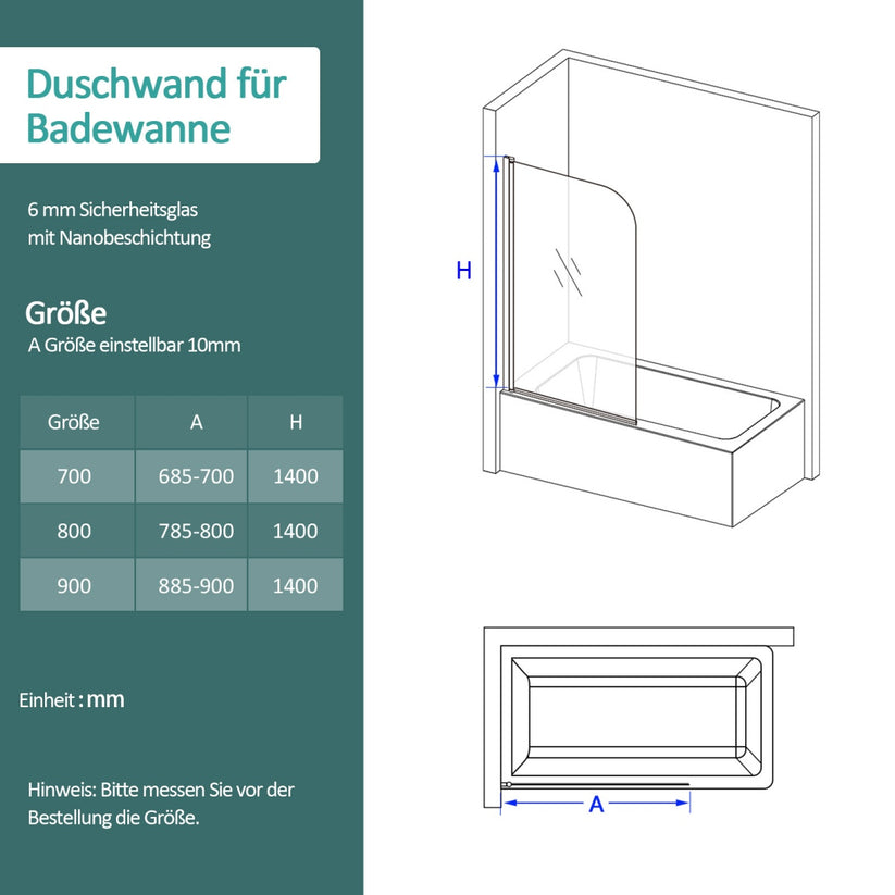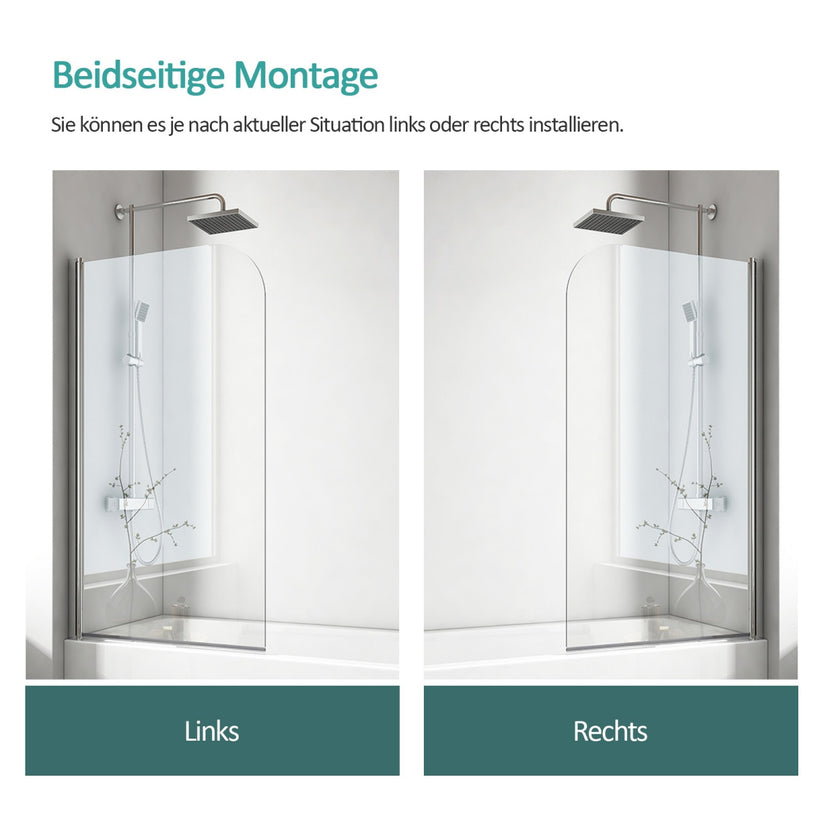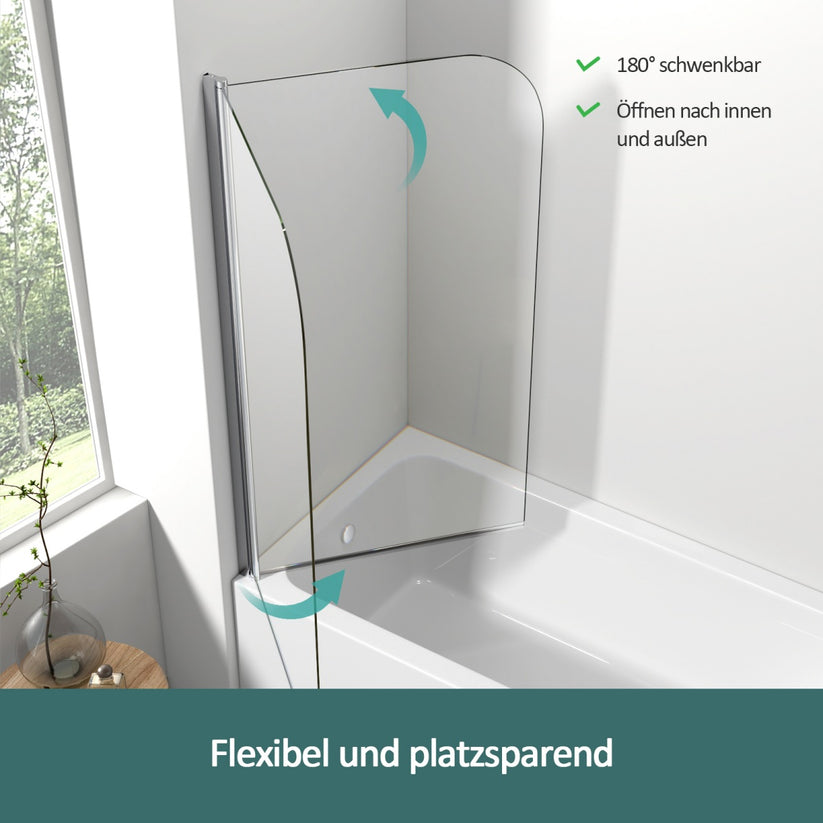 Diese rahmenlose Duschwand für Badewannen bietet effektiven Spritzschutz in kleineren Bädern. Das ESG‑Sicherheitsglas mit Nano‑Beschichtung erleichtert die Reinigung, während die Schwenkfunktion für mehr Flexibilität beim Einstieg sorgt.