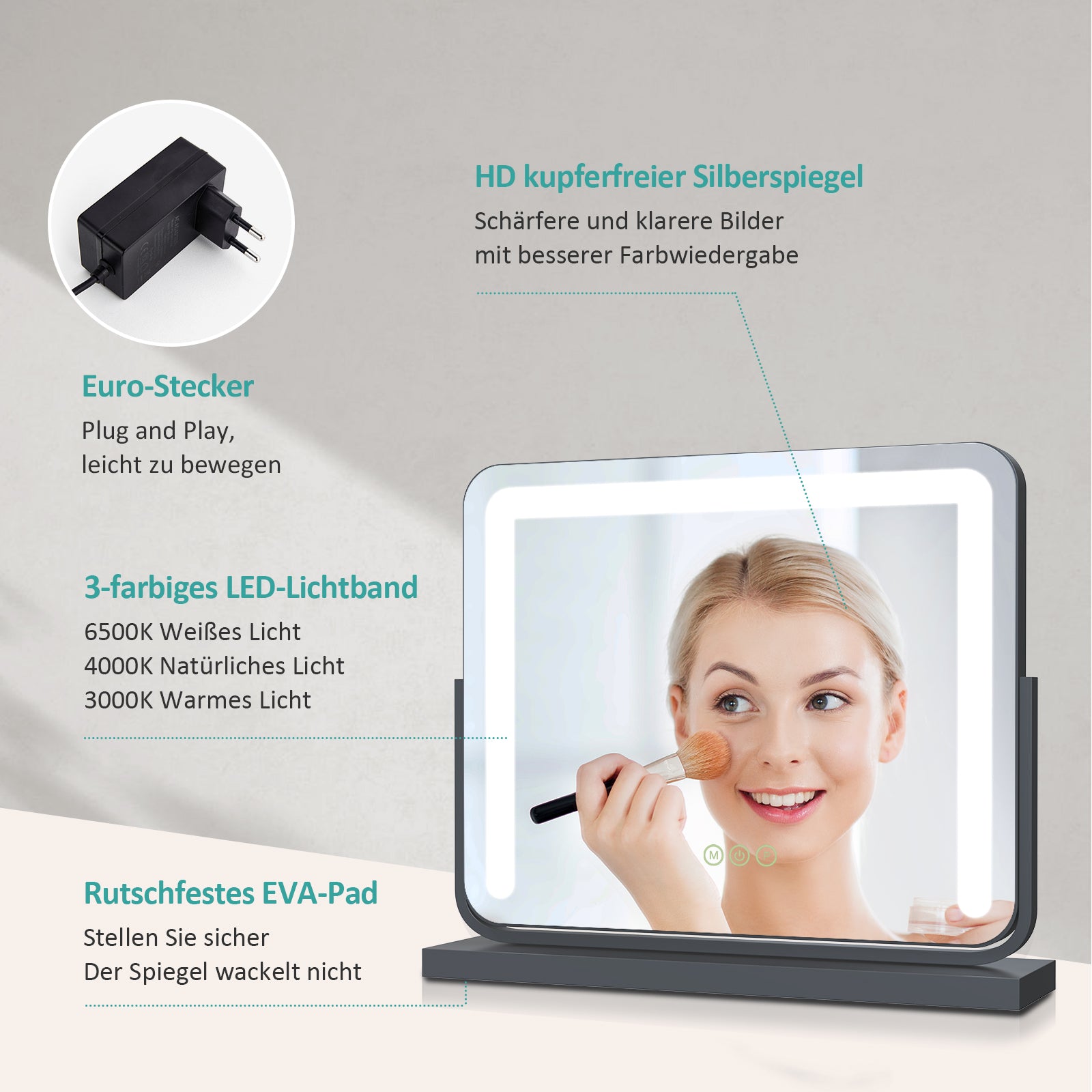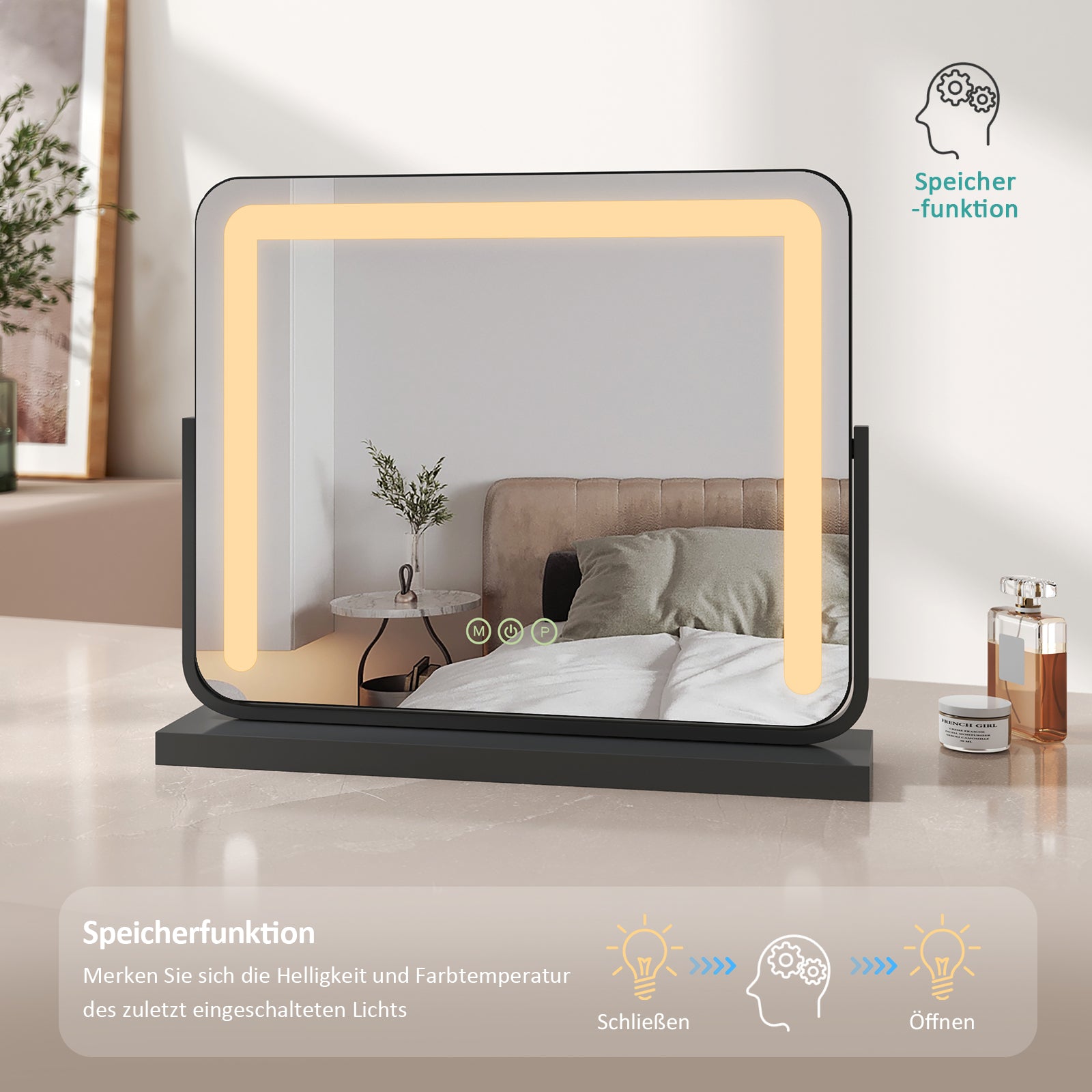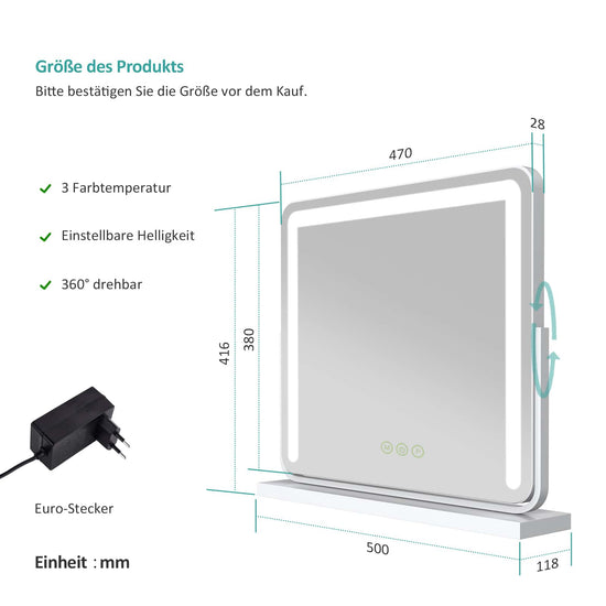 Kosmetikspiegel mit Beleuchtung, 3 Lichtfarben, Memory-Funktion & flexiblem Standfuß