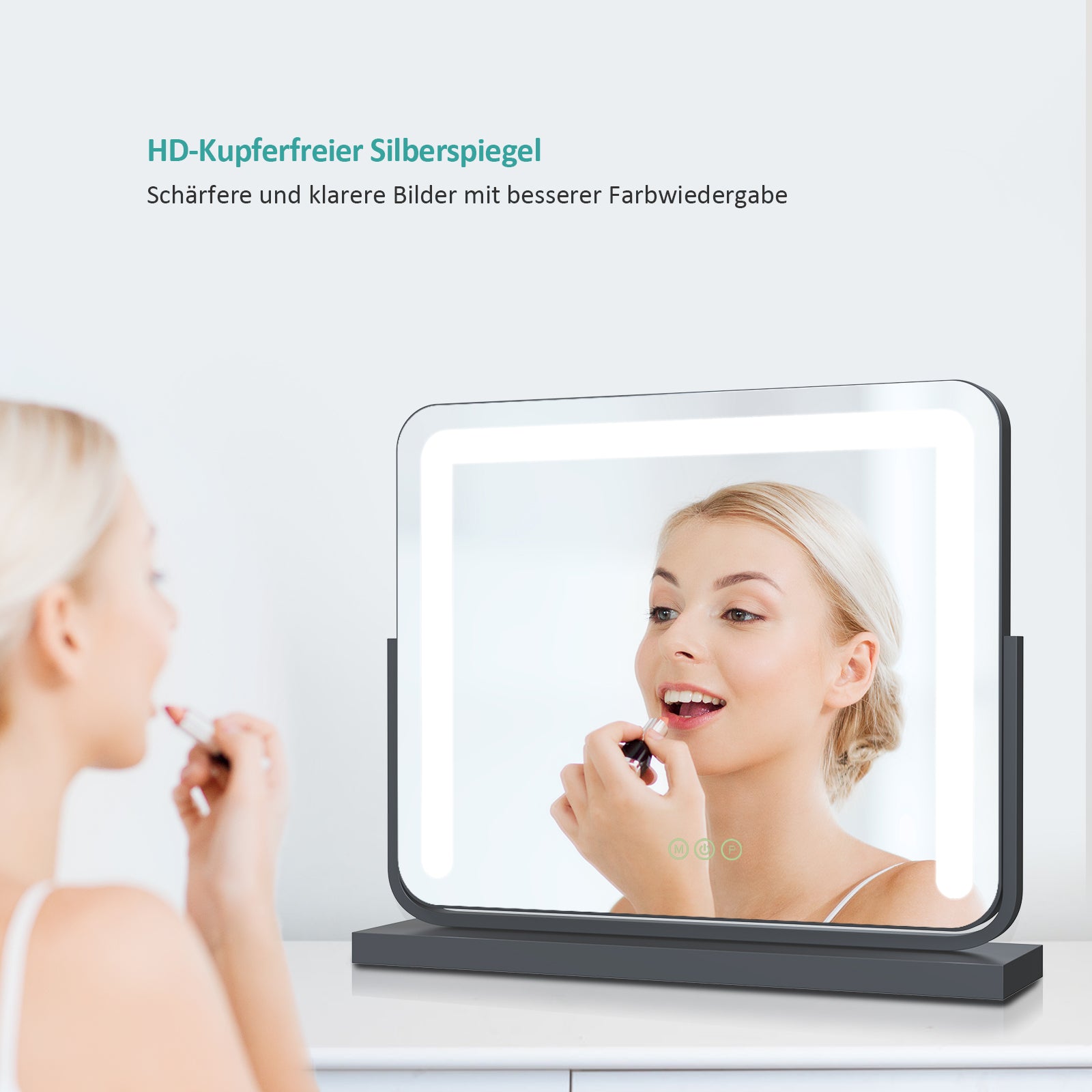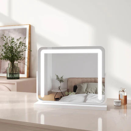 Dieser rechteckige Kosmetikspiegel mit abgerundeten Ecken bietet drei Lichtfarben und stufenlos dimmbare Helligkeit – ideal zum Schminken im Badezimmer oder Schlafzimmer.