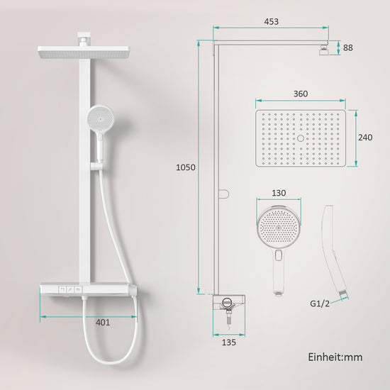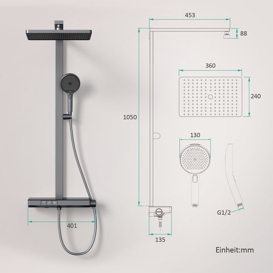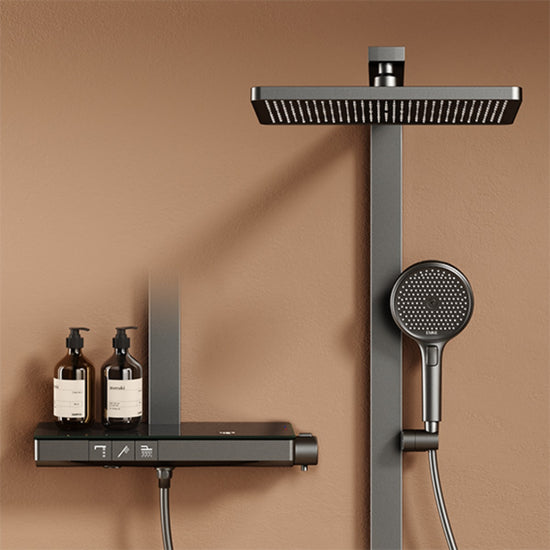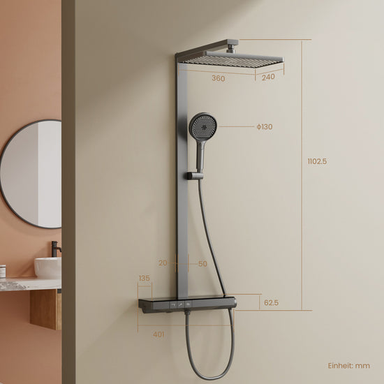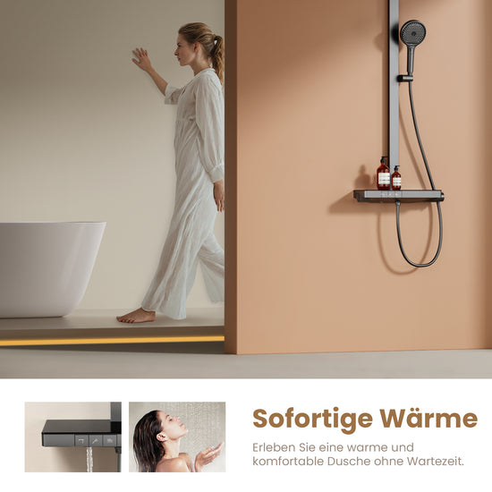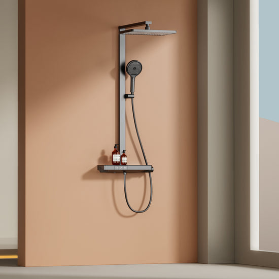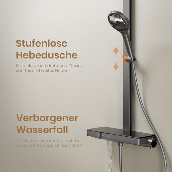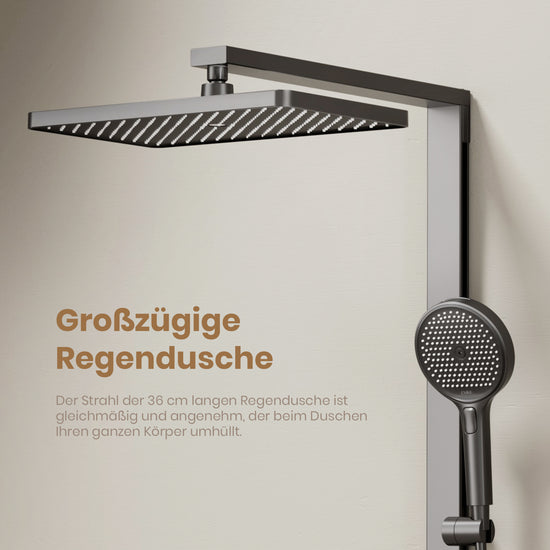 EMKE Duschsystem „F11“ – Thermostat-Duschpaneel mit Glasablage, 3 Strahlarten, Regendusche & Handbrause, 105×40,1×57,3 cm, anthrazit matt