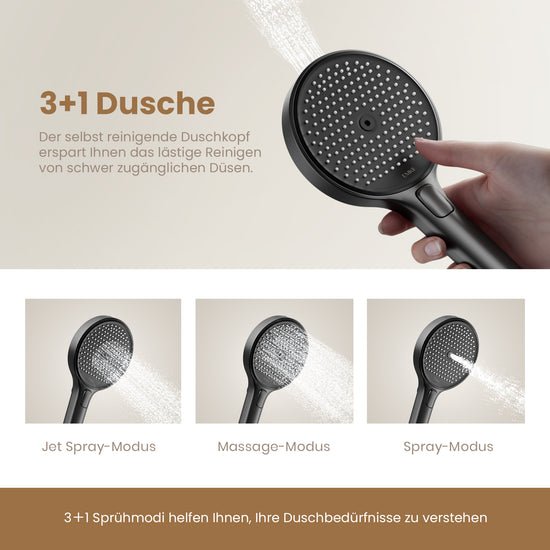 • 3 Wasserstrahl-Positionen per Knopfdruck – Wechseln Sie mühelos zwischen Handbrause, Regendusche (360° drehbar & ±15° neigbar) und bodennahem Strahl