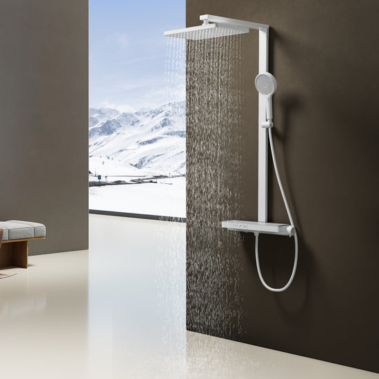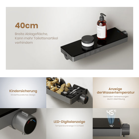 • Thermostat mit Glasablage & Temperaturanzeige – Die praktische Ablage aus gehärtetem Glas bietet Platz für Duschutensilien, die digitale Anzeige zeigt die aktuelle Wassertemperatur