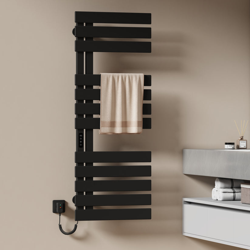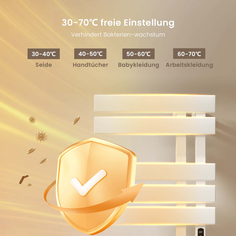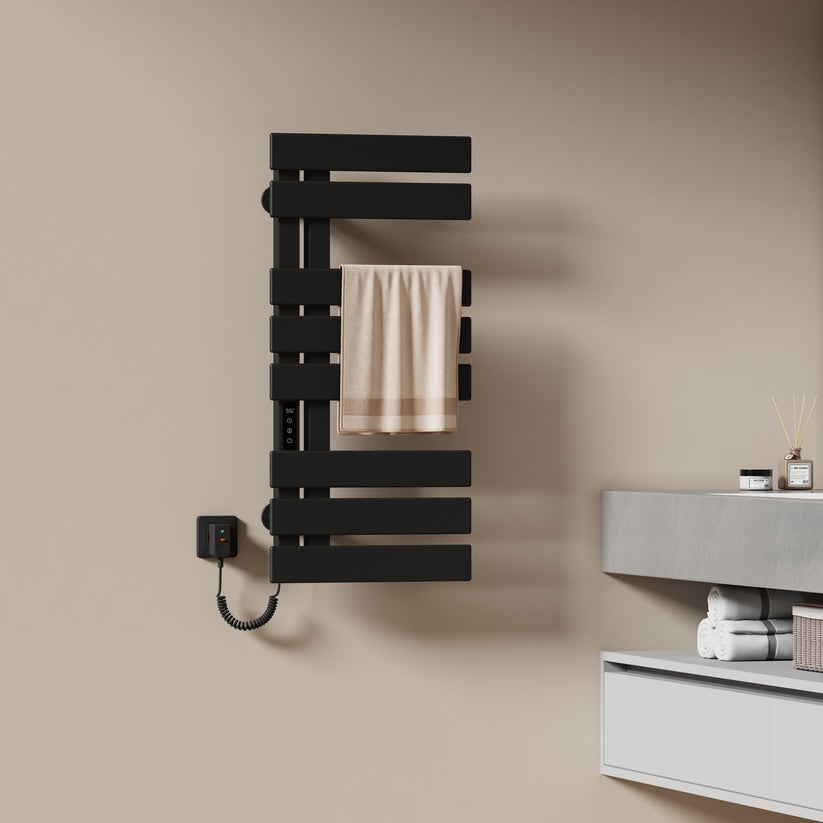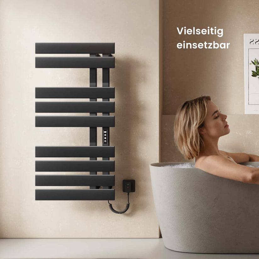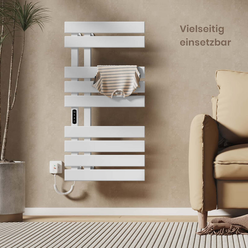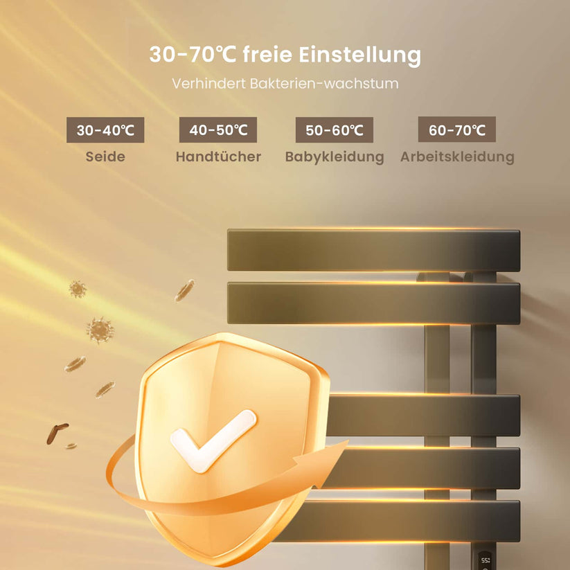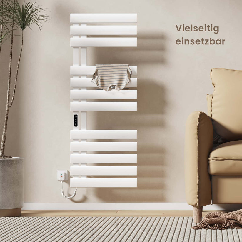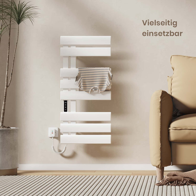Dieser elektrische Handtuchheizkörper trocknet Handtücher und Kleidung schnell und effizient mit moderner Kohlefaser-Technologie.