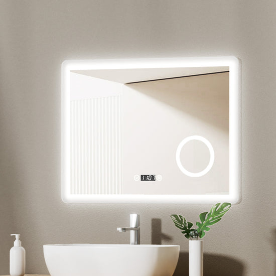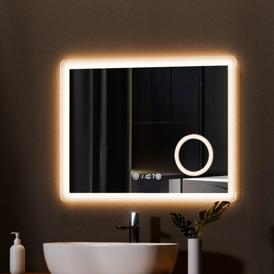 EMKE Badezimmerspiegel mit Beleuchtung "LeeMi πX Plus" 80x60cm, 3 Lichtfarben, Touch, Dimmbar, Beschlagfrei, Vergrößerungsspiegel, Uhr
