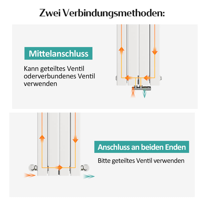 - 4 Anschlussarten: Der Heizkörper lässt sich auf 4 Arten installieren, entweder als Mittelglied oder als Seitenglied.