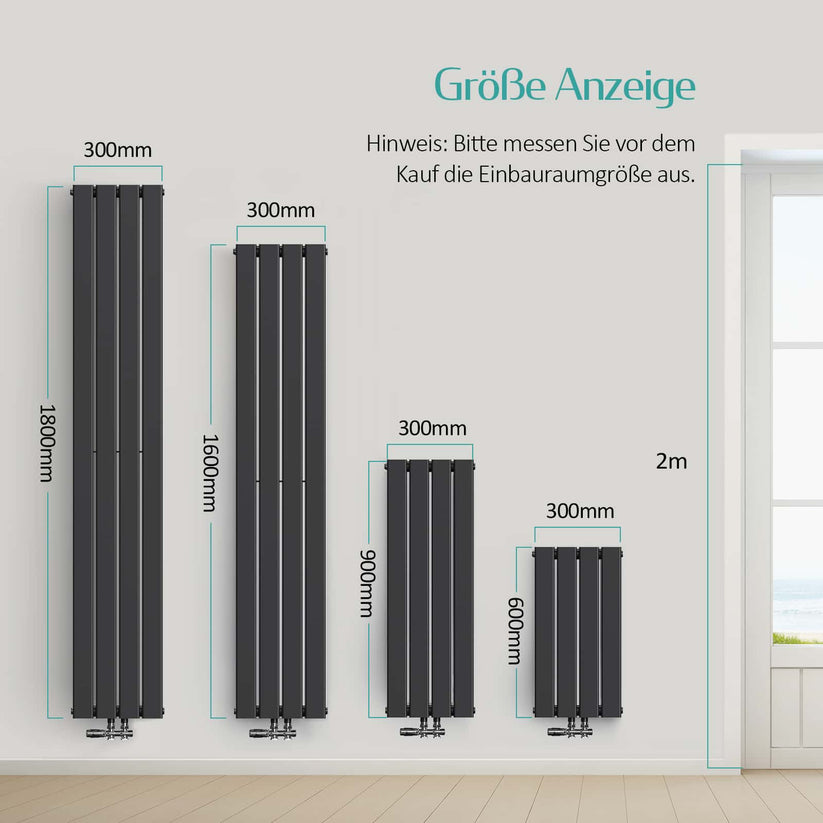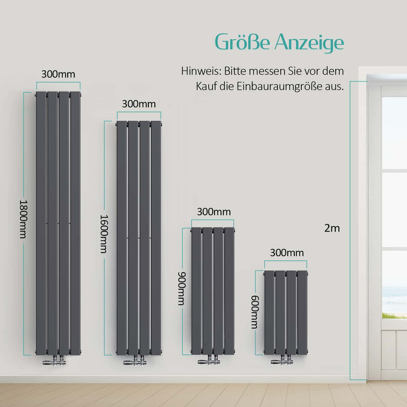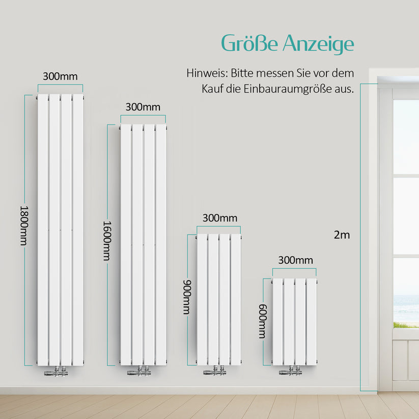 Artikelbeschreibung: Der Heizkörper hat ein ultra-schmales Design mit einer Breite von nur 30 cm und Höhen von 180 cm, 160 cm, 90 cm und 60 cm. Es gibt die Optionen einlagig oder zweilagig.