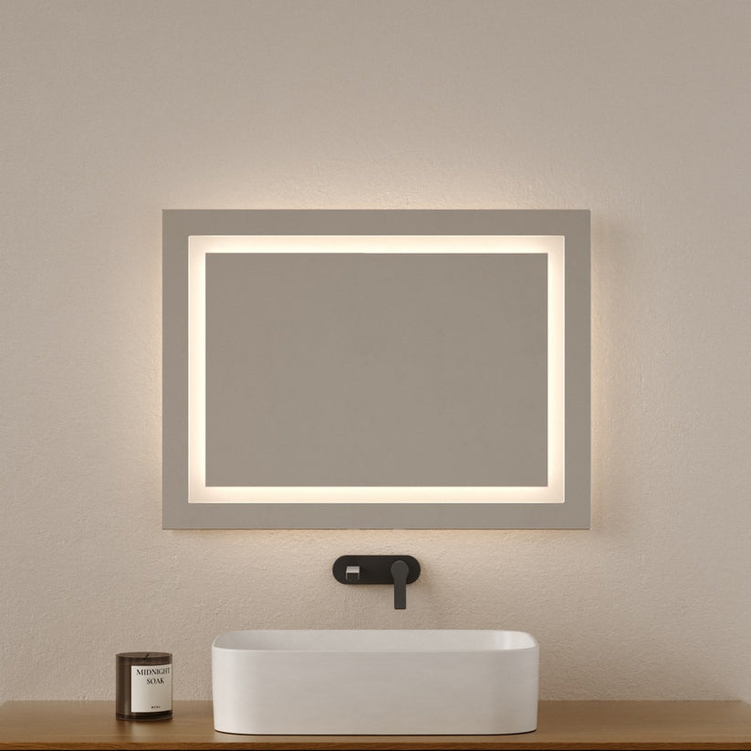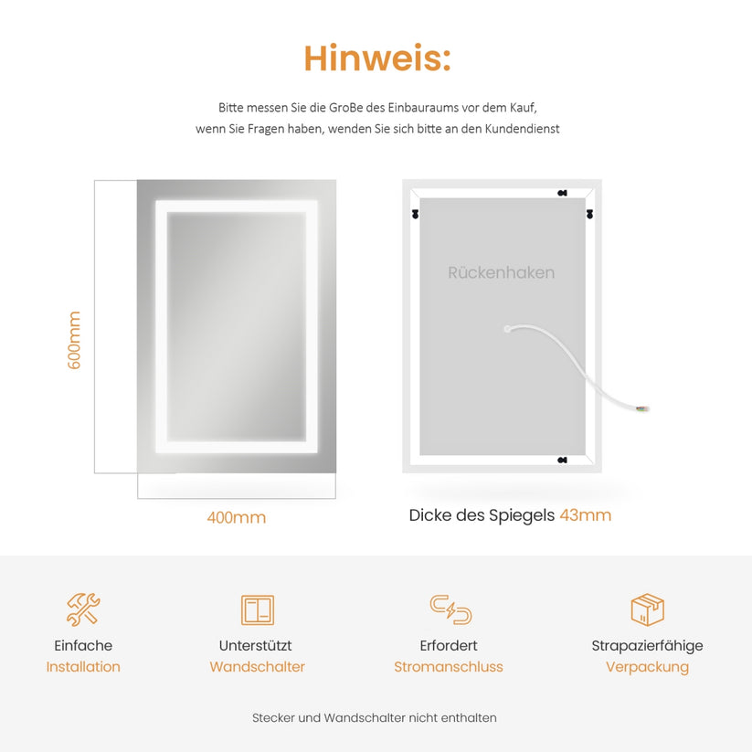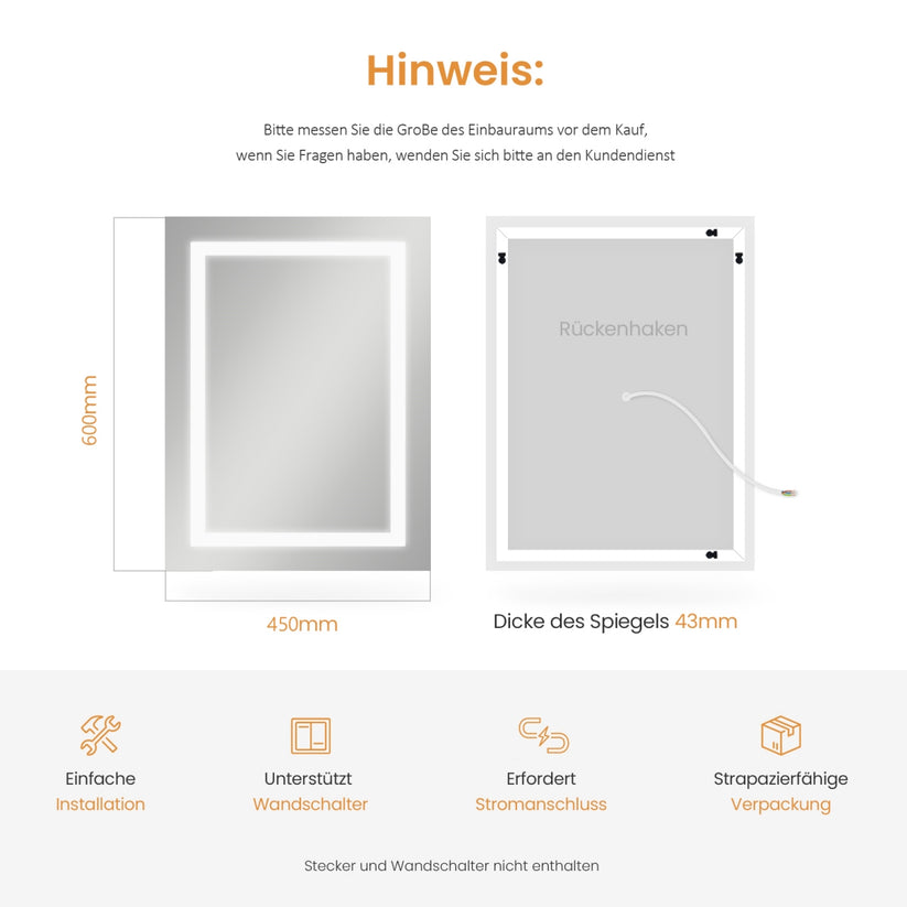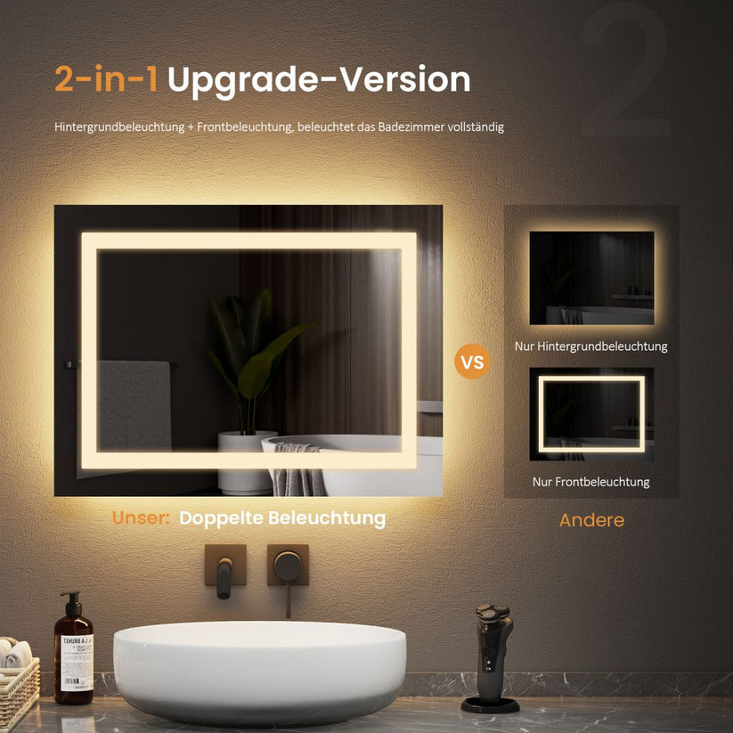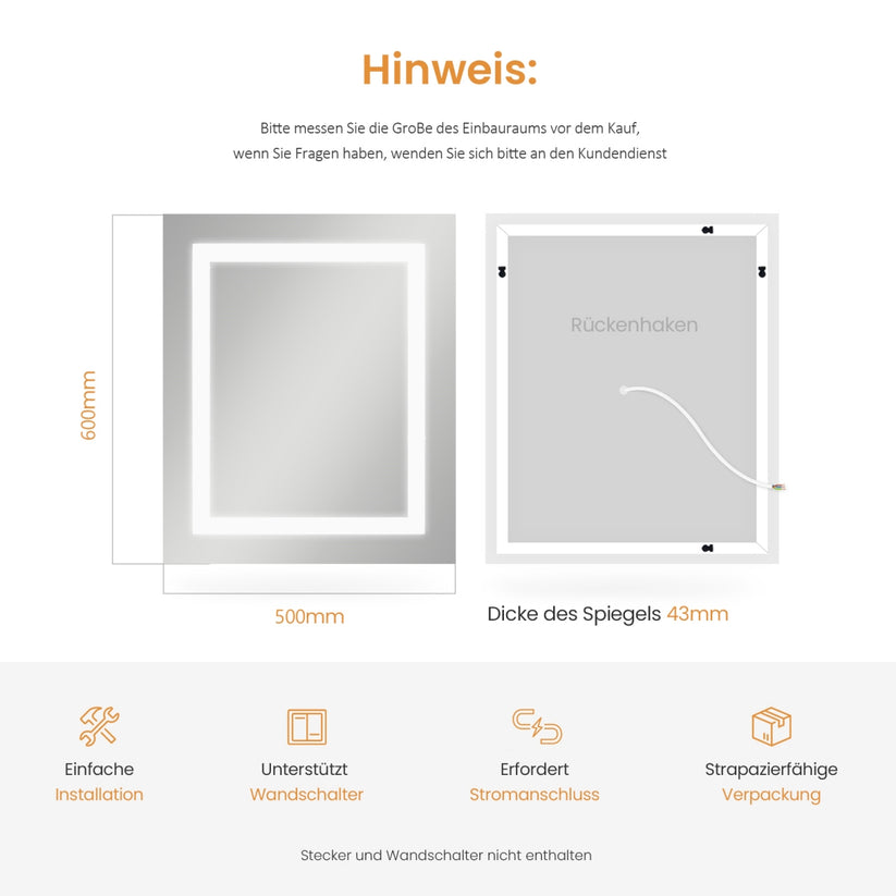 Dieser rechteckige LED-Badspiegel sorgt mit gleichmäßiger Beleuchtung und integrierter Anti‑Beschlagfunktion für klare Sicht – ideal für Badezimmer sowie Wohn- oder Essbereiche. Er kann vertikal oder horizontal montiert werden und passt sich flexibel Ihren Bedürfnissen an.