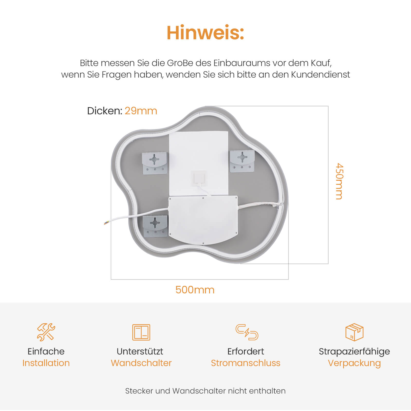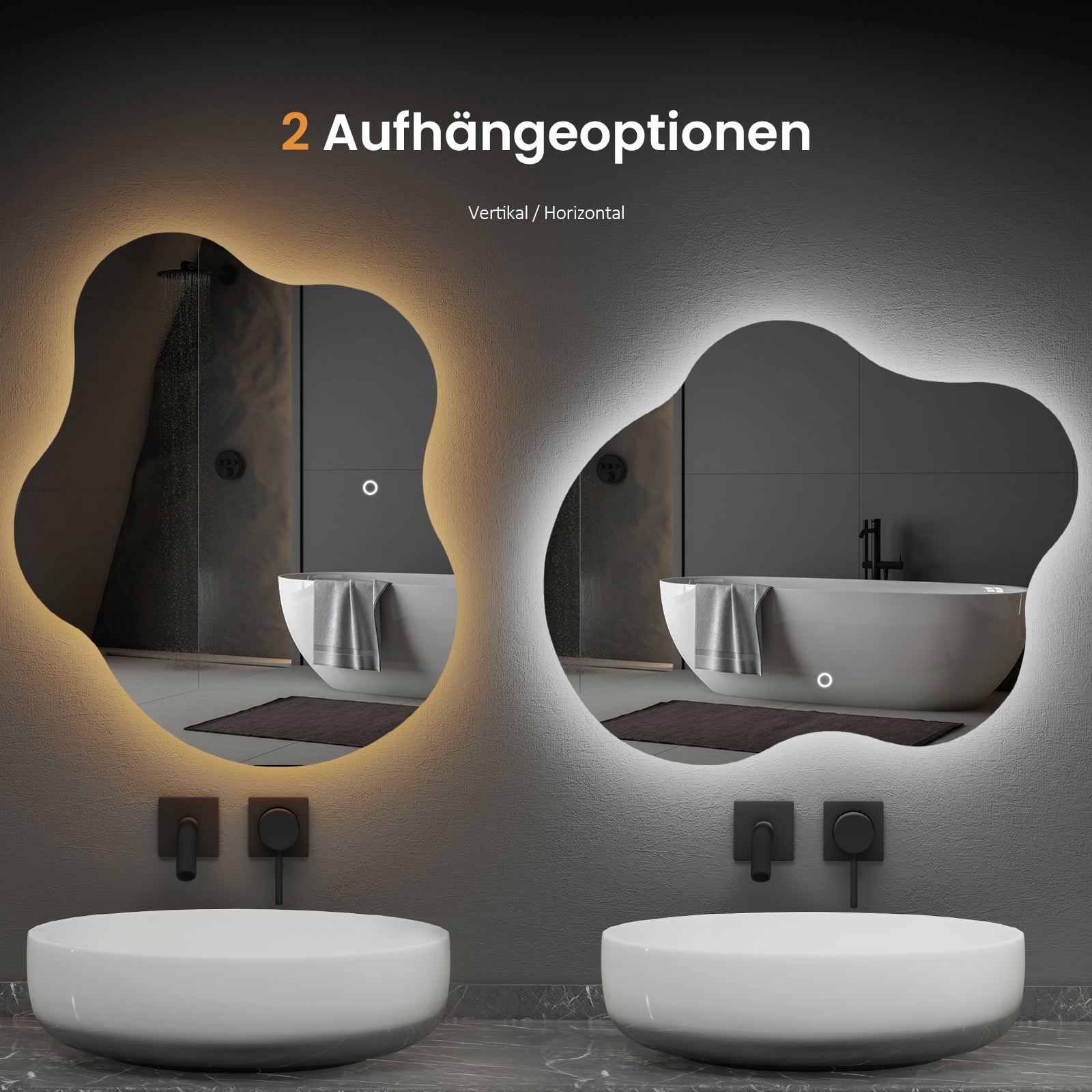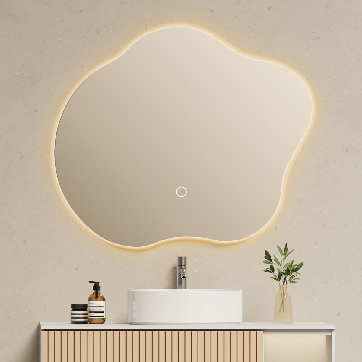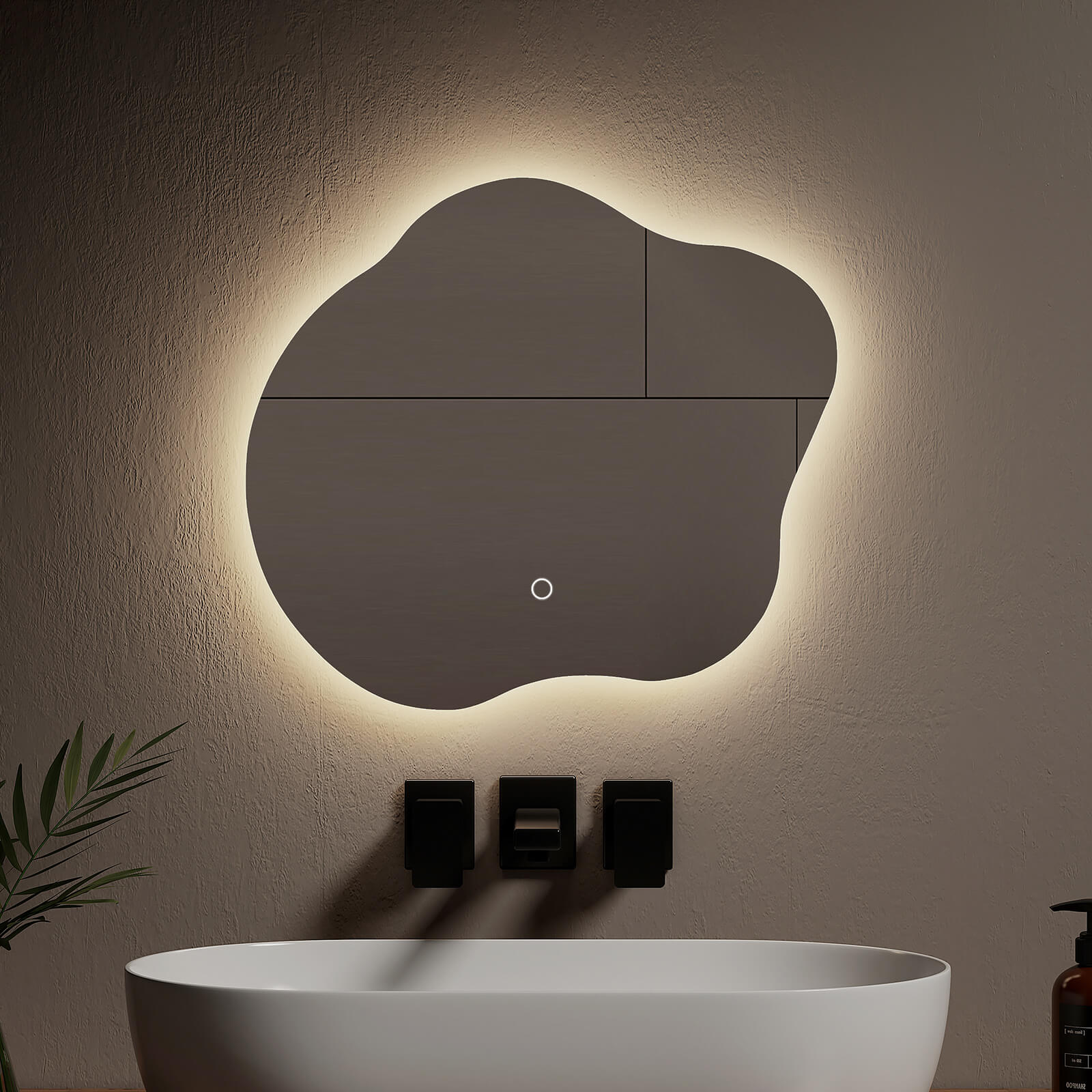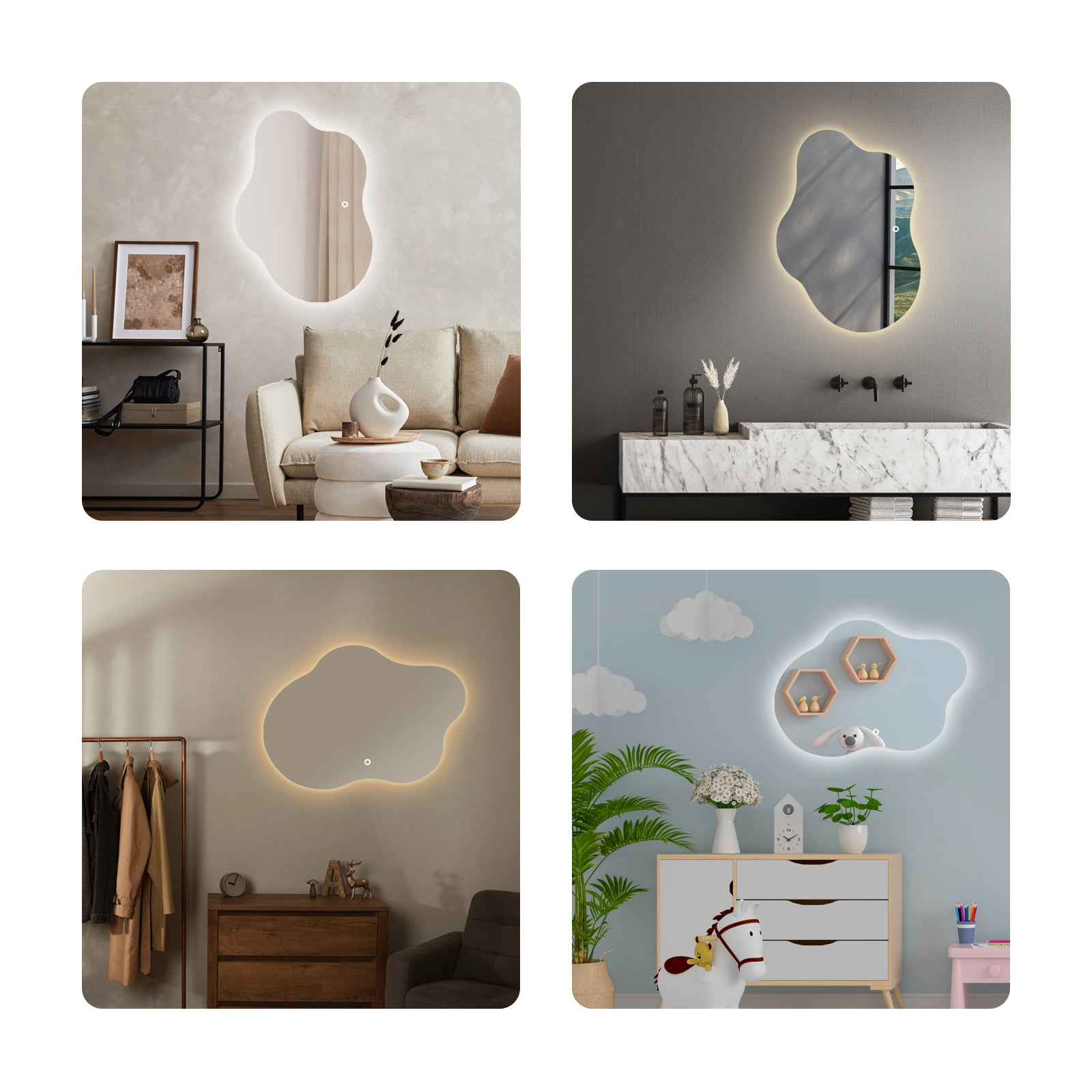 Dieser rahmenlose LED-Spiegel mit wolkenförmigem Design vereint modernes Aussehen mit praktischer Technik. Ideal für Badezimmer, Kinderzimmer oder als dekorativer Akzent im Wohnbereich.