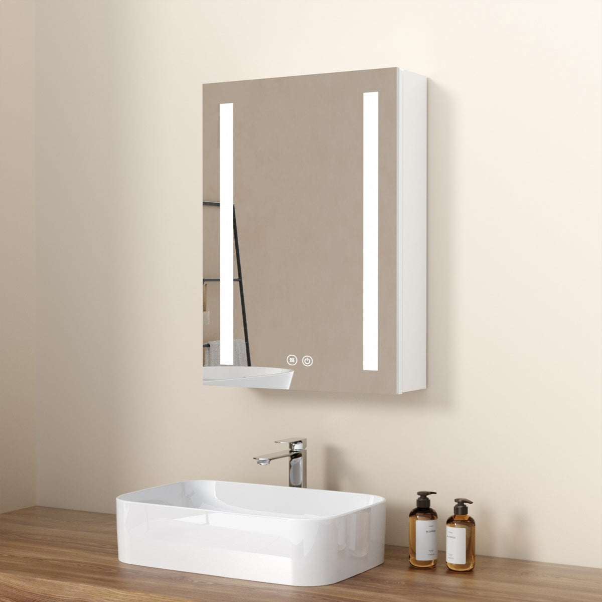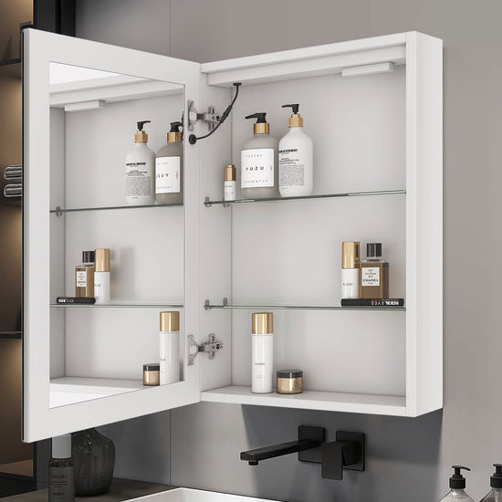 Dieser Spiegelschrank mit links angeschlagener Tür bietet funktionale Lichtsteuerung, integrierte Stromversorgung und clevere Stauraumaufteilung – ideal für moderne Badezimmer.