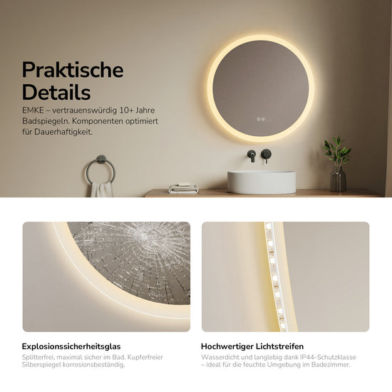 Dieser runde LED-Badspiegel kombiniert klare, gleichmäßige Beleuchtung mit einer zuverlässigen Anti‑Beschlagfunktion für perfekte Sicht im Badezimmer. Das blei‑ und kupferfreie Spiegelglas (IP44) sorgt für exzellente Reflexion und langanhaltende Qualität.