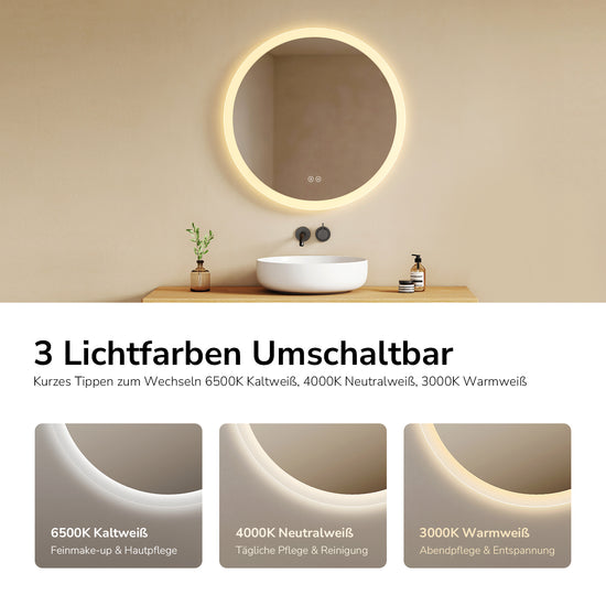 Spiegelheizung, Farbtemperatur einstellbar, Helligkeit einstellbar, Speicherfunktion und Automatische Abschaltung nach 3 Stunden