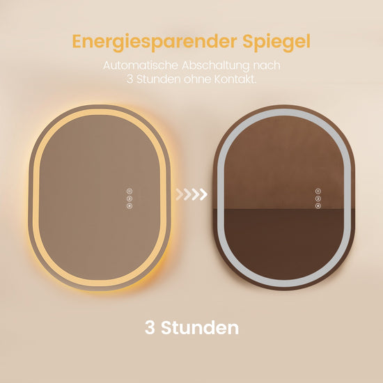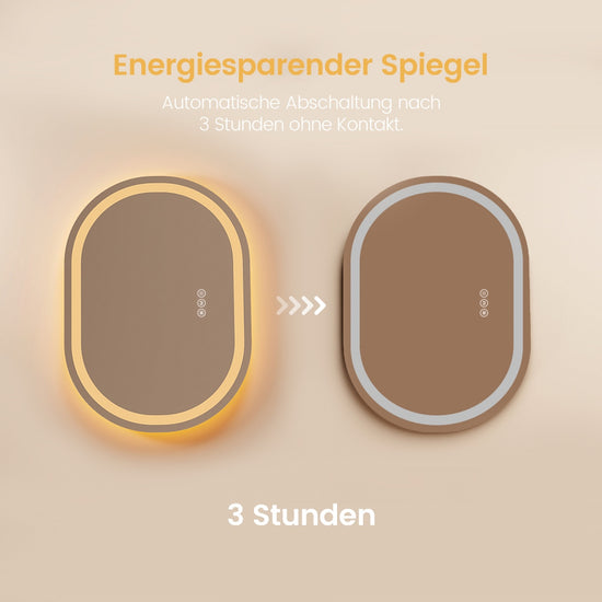 Spiegelheizung, Farbtemperatur einstellbar, Helligkeit einstellbar und Automatische Abschaltung nach 3 Stunden