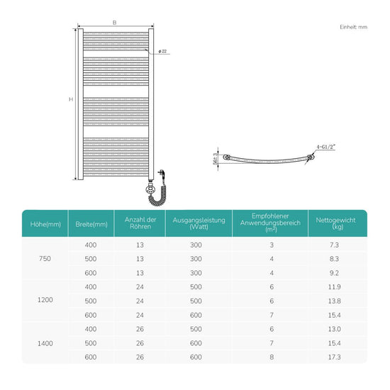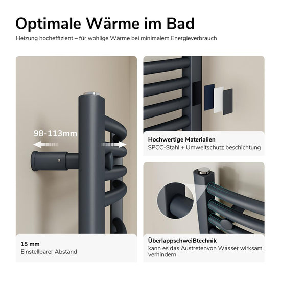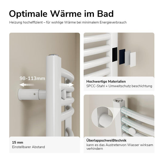 Dieser elektrische Handtuchheizkörper sorgt für angenehm warme Handtücher und hilft, Feuchtigkeit im Bad schneller zu reduzieren – ideal für ein hygienisches Raumklima. Die Temperatur und Heizzeit lassen sich bequem über das integrierte Thermostat einstellen.