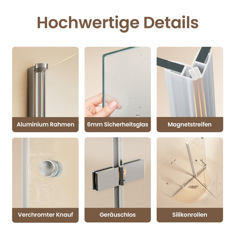 Diese platzsparende Eck-Duschkabine mit faltbarer Tür eignet sich ideal für kleine Badezimmer. Gefertigt aus 6 mm ESG-Sicherheitsglas und gerahmt mit Aluminium – stabil und pflegeleicht.